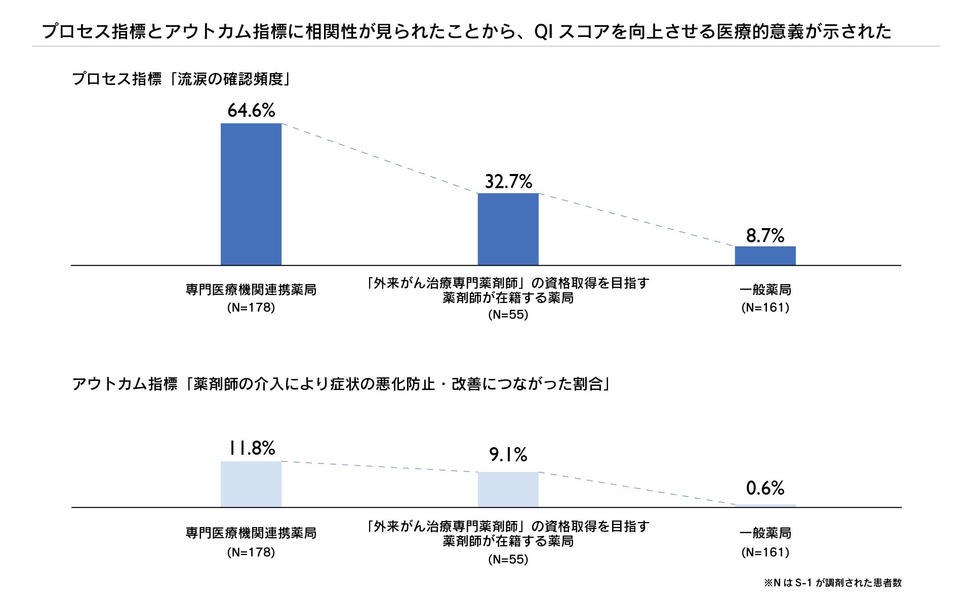 この結果から、抗がん剤の副作用の発現をこまめに確認したり、服薬期間中フォローを行ったりすることで、患者さんの流涙症状の把握や介入による改善に努める、専門医療機関連携薬局の対人業務の質の高さが評価できました。加えて、プロセス指標とアウトカム指標に相関性が見られたことから、QIスコアを向上させる医療的意義が示されました。