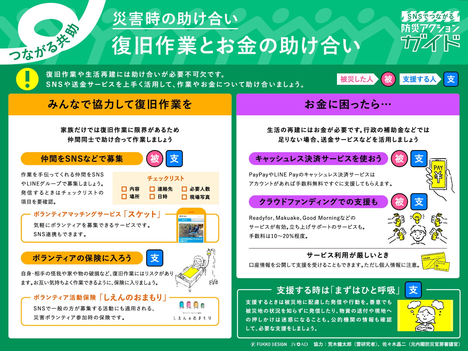 復旧作業の仕方や、お金の支援をする/される方法を解説しています。