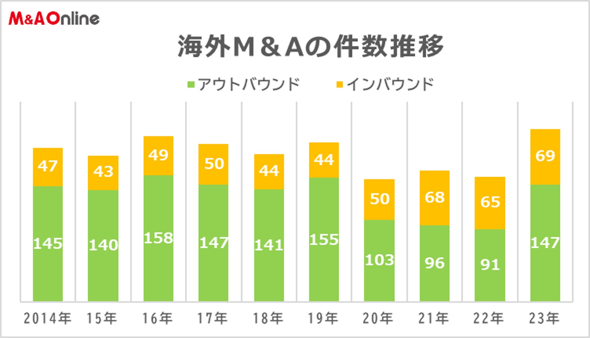 海外M&Aは日本企業が買い手のアウトバウンド取引と、外国企業が買い手のインバウンド取引に区分されます。全216件のうち、アウトバウンド取引は147件(前年91件)、インバウンド取引は69件(同65件)。アウトバウンド取引が6割以上増え、復調ぶりが際立つ一方、インバウンド取引は前年とほぼ同数で高止まりとなりました。