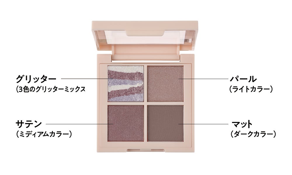 既存品と同様に、マット・サテン・パール・グリッター、4つの質感が楽しめるマルチパレットなので、