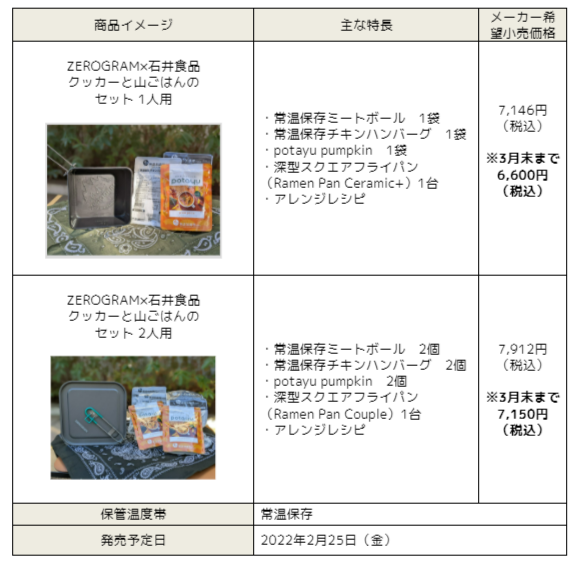 アウトドアブランド ZEROGRAMとコラボレーション「ZEROGRAM×石井食品 クッカーと山ごはんのセット」オンライン限定販売