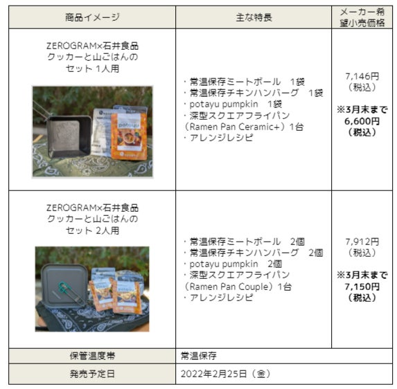 無添加調理※で商品作りを進めている石井食品株式会社(本社:千葉県船橋市、代表取締役社長執行役員:石井智康、以下、石井食品)は、ライトバックパッカー向けアウトドアブランド株式会社ZEROGRAM(所在地:東京都港区、代表取締役社長 スコットキム、以下 ZEROGRAM)と、「ZEROGRAM×石井食品 クッカーと山ごはんのセット」を石井食品公式オンラインストア無添加調理専門店 「イシイのオンラインストア」(https://shop.directishii.net/)とZEROGRAM公式サイト(https://www.zerogram.co.jp/)限定で2022年2月25日(金)から販売を開始します。