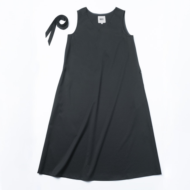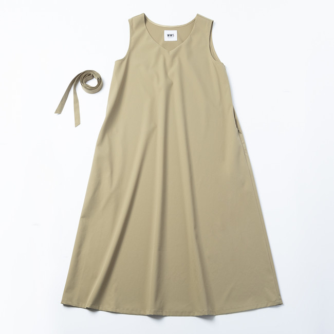 独自開発の新素材「Ultimex/アルティメックス」を使用し、365日洗濯機で丸洗いでき、しわになりにくく、3時間で乾く驚きの機能性を実現。取り外し可能なウエスト紐は付けるとキチンと見え、外すと落ち感のあるリラックスシルエットの2way仕様。裾にかけて広がっていくAラインシルエットは体のラインを拾わず、女性らしいエレガントさを演出。シャープなVネックは顔周りをすっきりとした印象に。サイドのジップポケットはスマホや三つ折り財布も収納可能。
