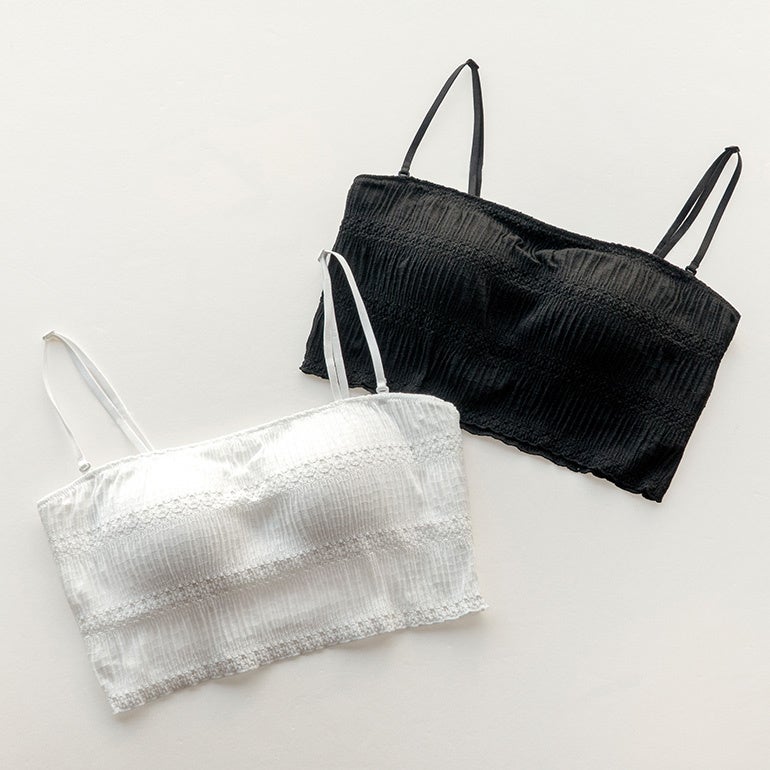 「レーシィチューブトップブラ」は、取り外し可能な細いストラップ付きの2way仕様。ボーダー柄のレースで生地調部分には立体的なギャザー加工を施しており、この商品1着での着こなしはもちろん、流行中のシアートップスとのコーディネートも楽しめます。オフショルダーや開きの大きいアウターともコーディネートしやすく、シーンに合わせて幅広く使い分けできます。