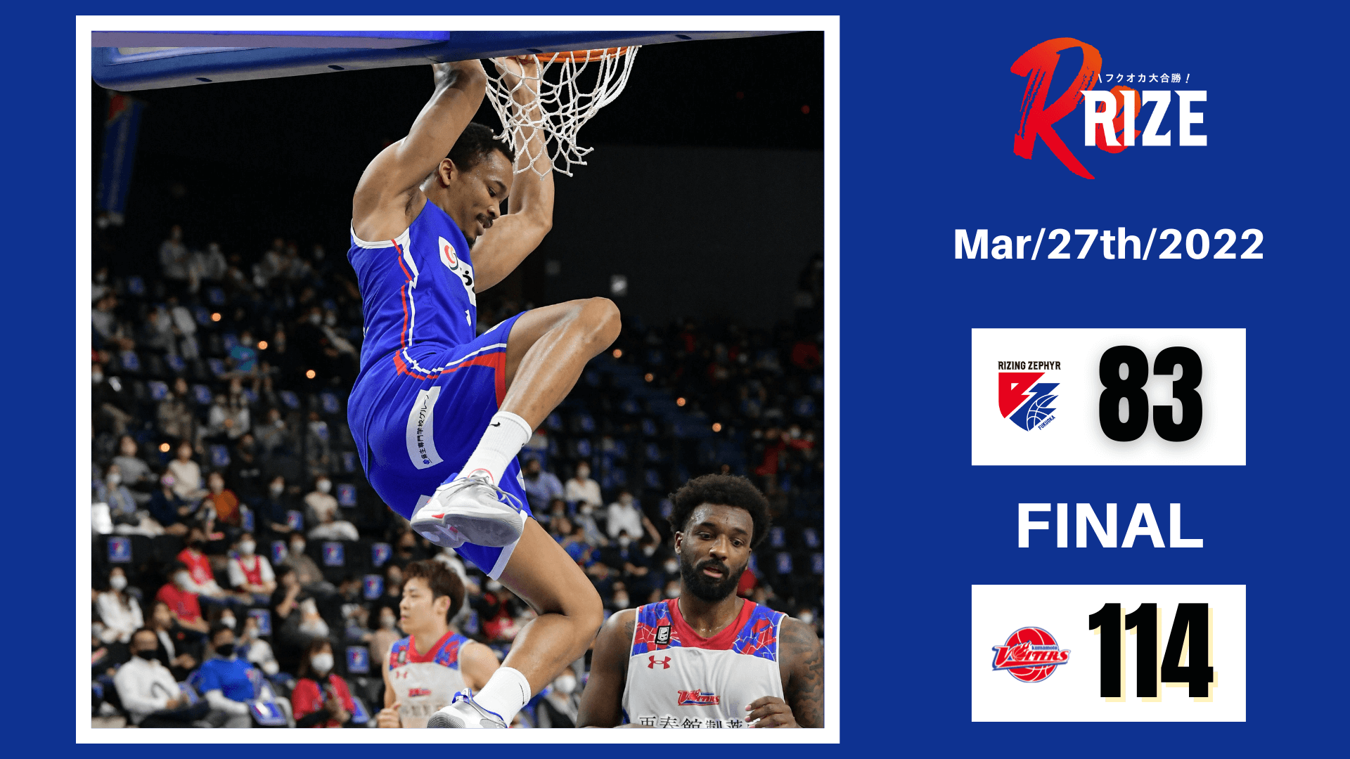 2022年3月27日(日)に開催されましたBリーグ第28節【ライジングゼファーフクオカvs.熊本ヴォルターズ】において“福岡83-114熊本”の結果となりましたことお知らせいたします。