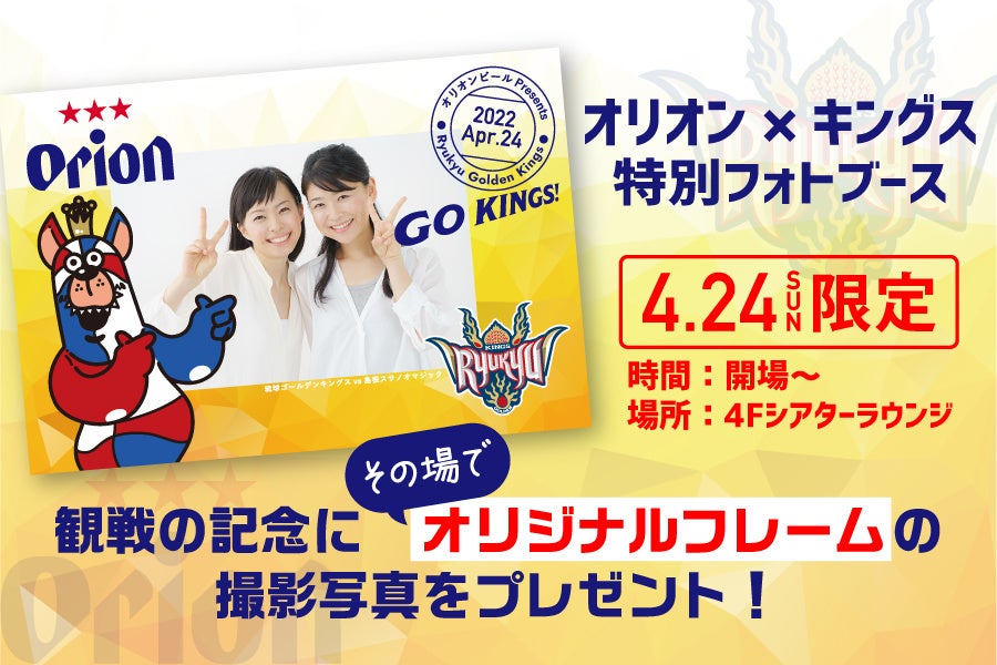 4Fシアターラウンジにこの日限りのフォトブースが登場!撮影した写真は、その場でキングスコラボのオリジナルフレームとあわせてお受け取りいただけます。オリオンGAMEご観戦の思い出を記念写真で残しましょう!
