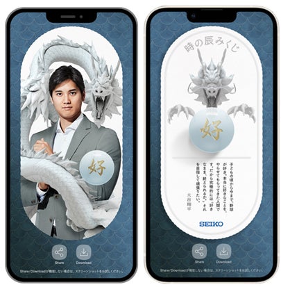 専用ARアプリをインストールしたスマートフォンをSEIKO HOUSE GINZAの建物全体にかざすと、ショーウインドウを飾る干支の“時の龍(辰)”が解き放たれ、SEIKO HOUSE GINZAから銀座の空へと舞い上がる様子を臨場感あふれる演出で体験いただけます。また、舞い上がった龍が運ぶ「時の辰みくじ」では、セイコーのスポーツ公式計時開始60周年を記念し、大谷翔平選手やTeam Seikoなど、セイコーに所縁のあるアスリートからのメッセージをお届けします。2024年の幕開けは、銀座で特別なひと時をお楽しみください。