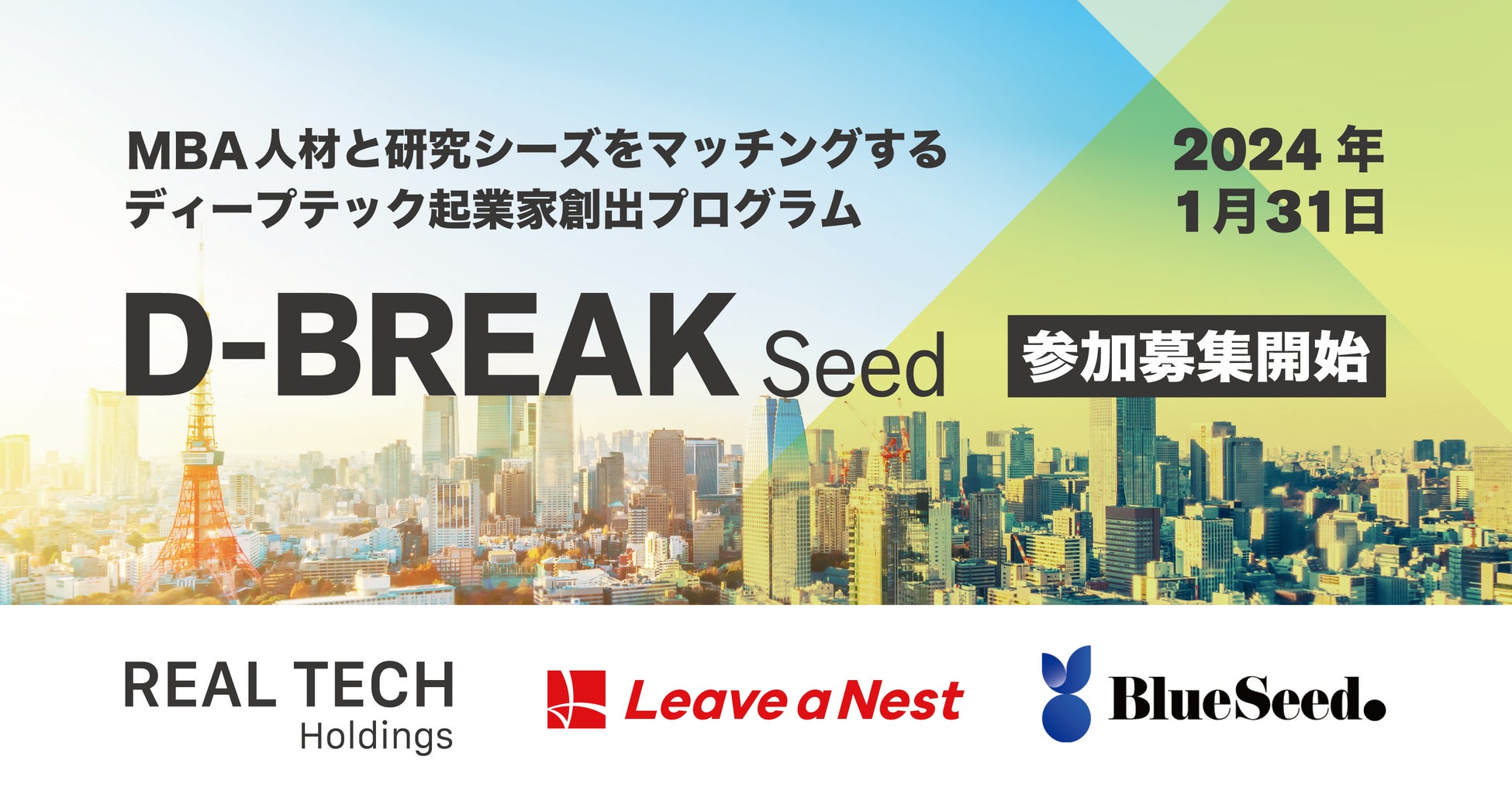 リアルテックホールディングス株式会社(以下、リアルテックHD)が企画運営、株式会社リバネス(以下、リバネス)、合同会社BlueSeed.(以下、ブルーシードット)が共同運営となり、MBA人材※1と研究シーズをマッチングし、ディープテックスタートアップの起業家を創出するプログラム「D-BREAK Seed」(ディーブレイクシード)の参加者募集を開始いたします。