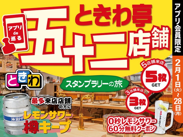 「0秒レモンサワー® 仙台ホルモン焼肉酒場 ときわ亭」公式アプリで52店舗巡る『ときわ亭スタンプラリー』2月1日(火)~2月28日(月)の期間限定で開催