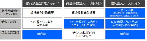 2023年6月施行の改正資金決済法上、SC(電子決済手段)として、「銀行預金型」・「資金移動型」・「信託型」の3類型が想定されています。JPYC社では、資金移動型SCとしての「JPYC(資金移動型)」の発行も検討していますが、本共同検討では、送金金額制約のない信託型SCとしての「JPYC(信託型)」の組成を前提*1としています。