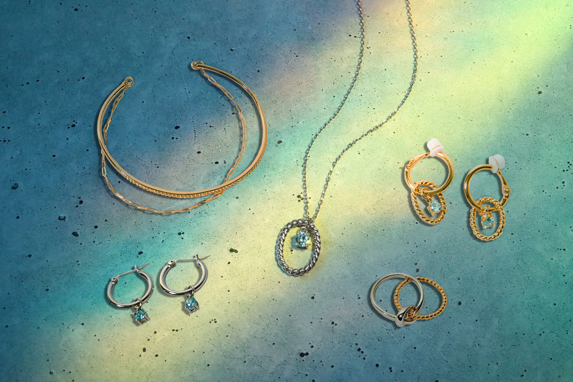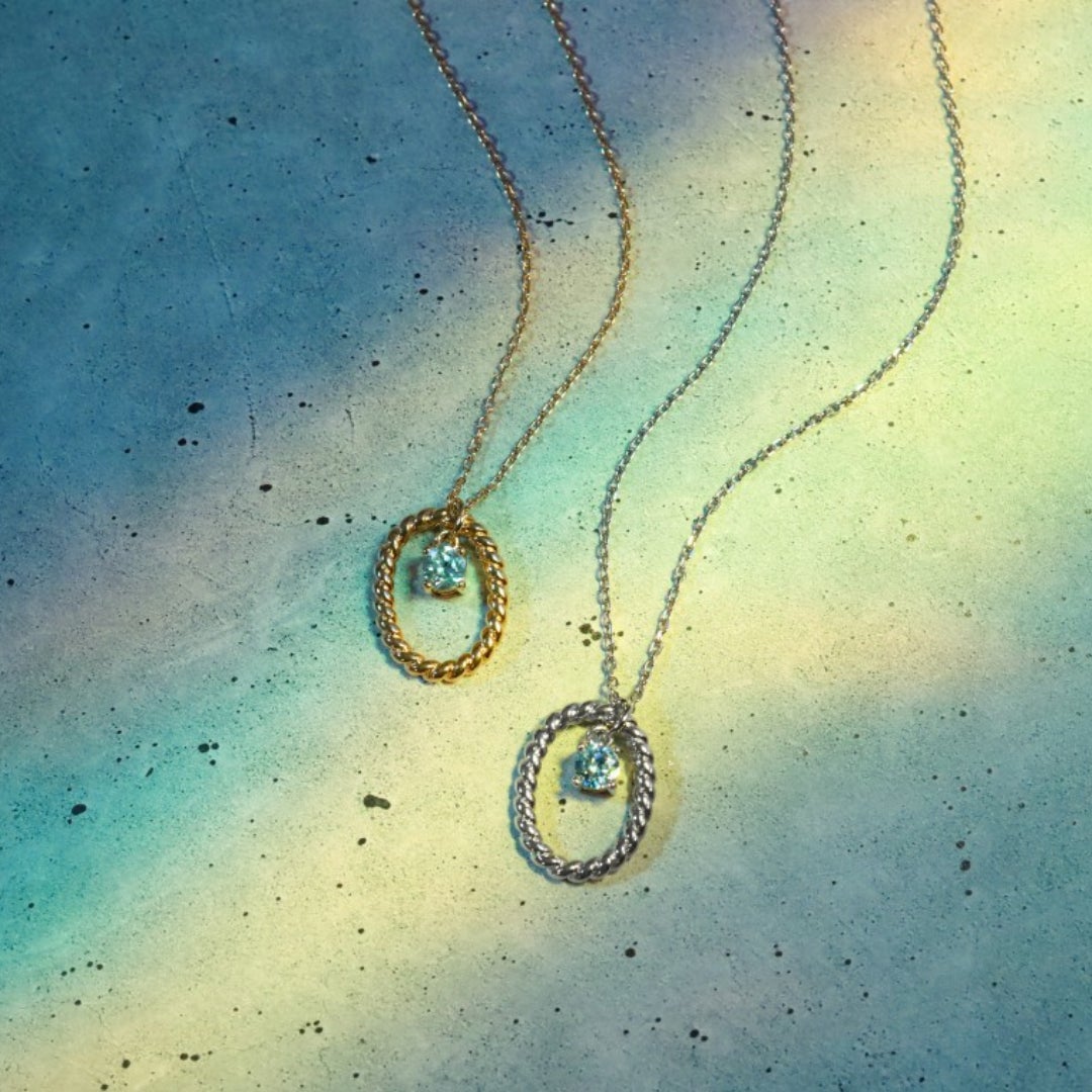 浮かぶ惑星のように、フレームに浮かび上がるブルーのストーンが神秘的な輝きを放つネックレス「プラネットネックレス」。