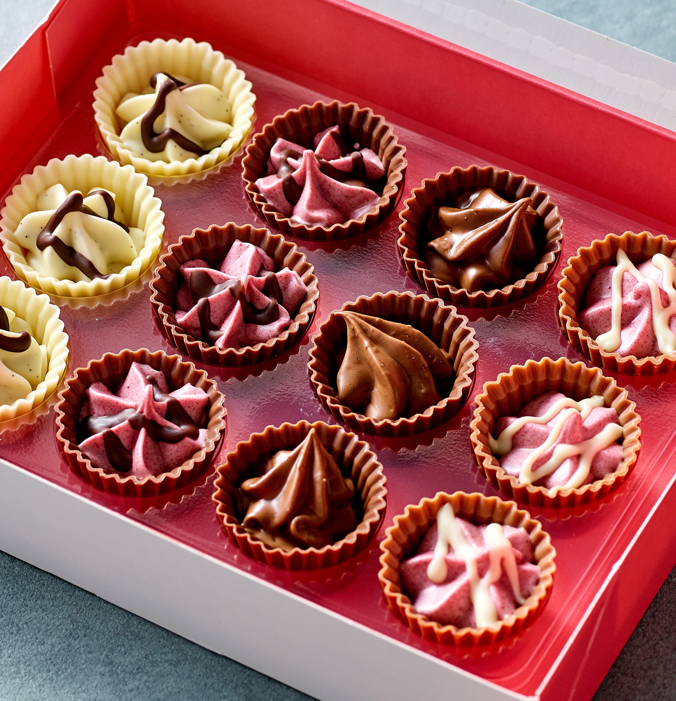 ラズベリー&ミルクチョコレート、ラズベリー&キャラメル、バニラ、チョコレート&ヘーゼルナッツ。アイスクリームをイメージした4種類の フレーバーを詰め合わせました。