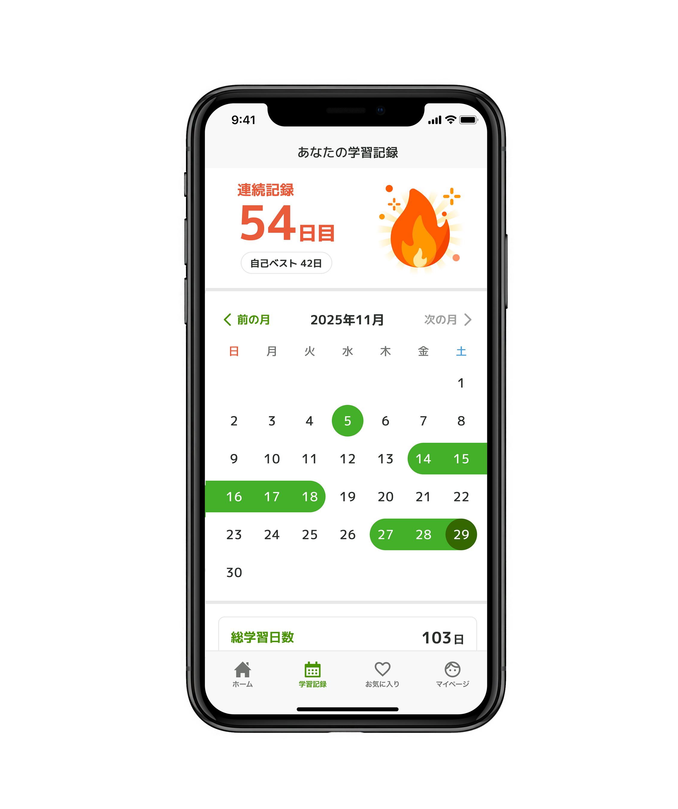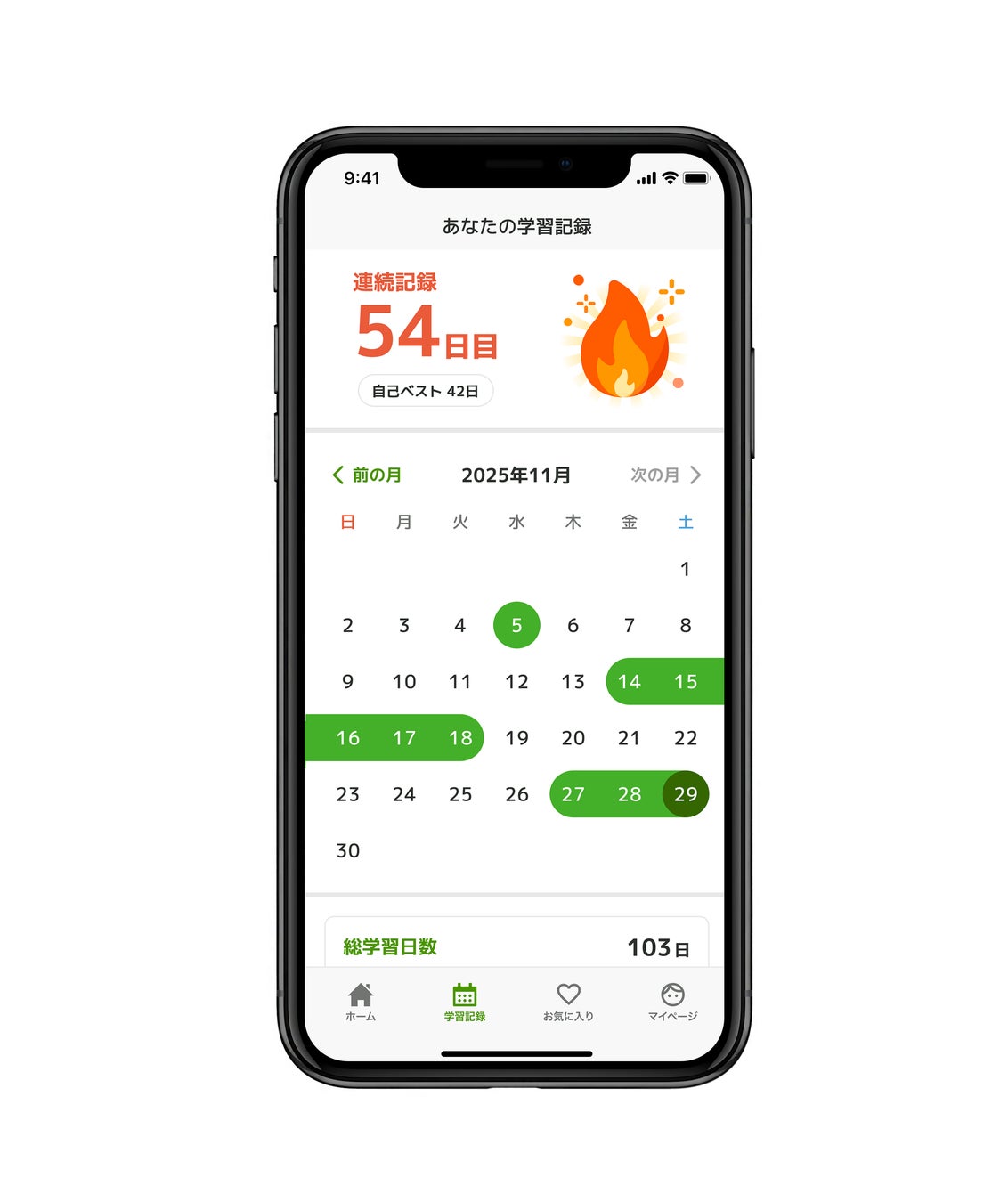 「あなたの学習記録」として、学習連続記録日数(自己ベスト日数)、総学習日数・学習時間が表示されます。 これまでの積み重ねが楽しいビジュアルで可視化され、モチベーション管理に役立ちます。