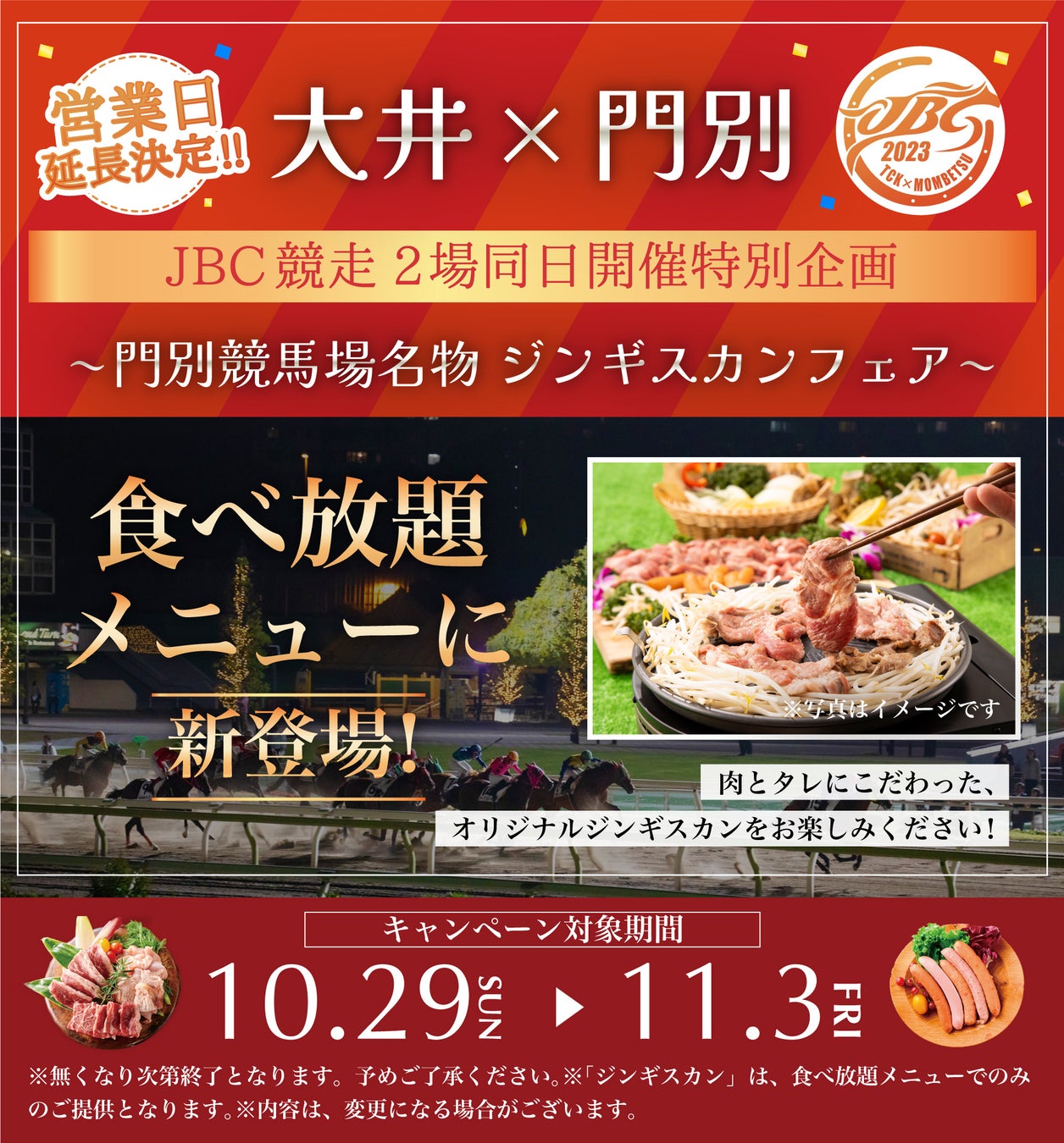 このたび、ご要望の多かったJBC当日(11/3)までの営業期間の延長が決定し、あわせてJBC2023大井×門別の開催を記念し、第12回開催(10/29~11/3)期間中の食べ放題プランご利用で門別競馬場名物“ジンギスカン”がメニューに追加となる特別企画を実施しますので、お知らせいたします。