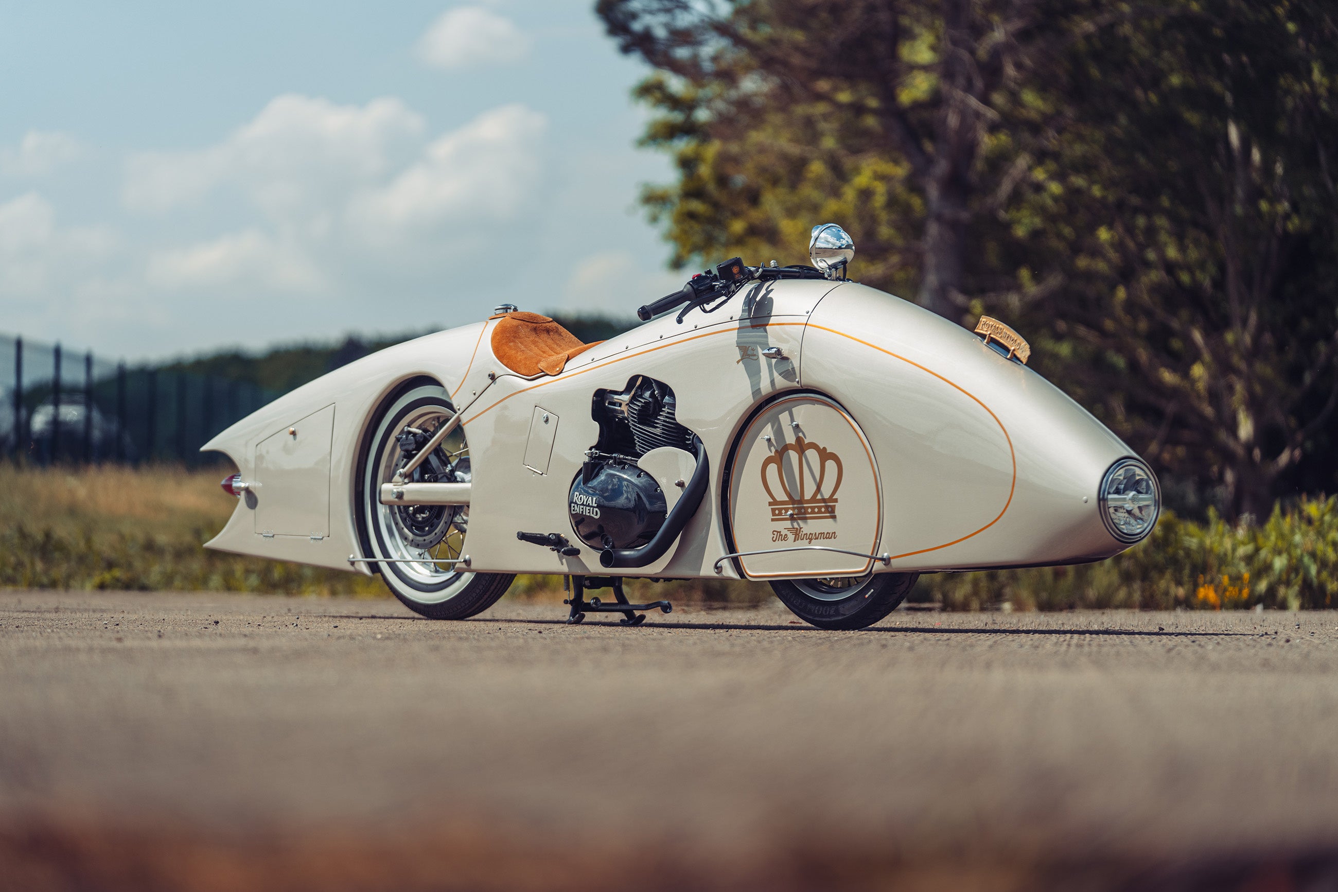 ベースマシンはSHOTGUN 650。「The Kingsman(ザ・キングスマン)」と名付けられたこのカスタムバイクを製作したのは、ドイツを拠点に活動するキングストンカスタムです。デザイナーであり、カスタムバイクビルダーであるDirk Oehlerking(ディレク・オーラーキング)は、2mm厚のアルミ鋼板を板金加工で成形し、全長約4mのストリームライナースタイルに仕上げました。もちろんこの車両は実走可能です。映画『キングスマン』の世界観を体現するため、紳士の嗜みに欠かせないアイテムがリア周りの特製ボックス内に収められています。