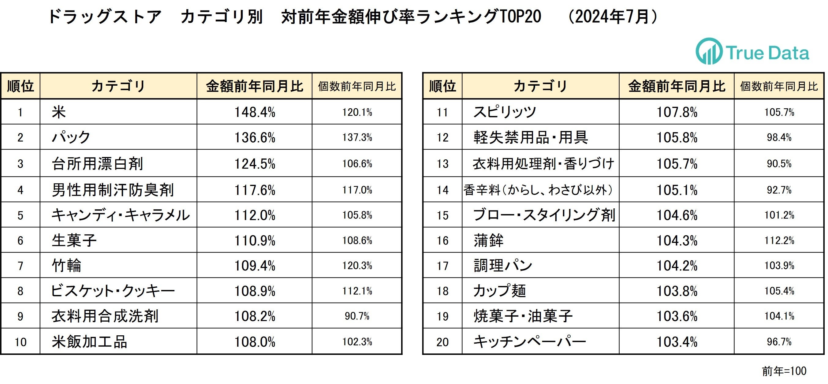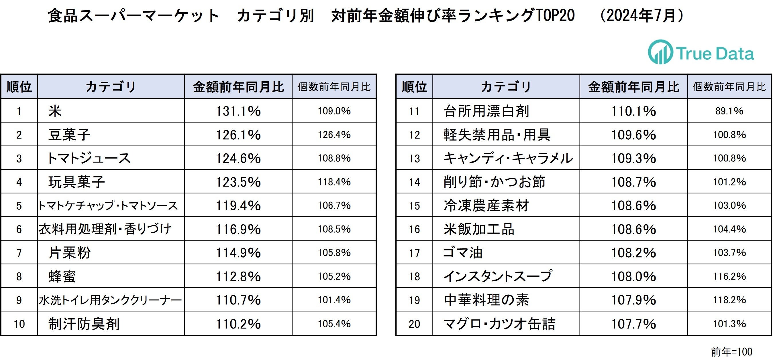 ビッグデータプラットフォームを運営する株式会社True Data(トゥルーデータ/本社:東京都港区、代表取締役社長:米倉 裕之、証券コード4416)は、当社の統計データをもとに、ドラッグストア、食品スーパーマーケットにおける2024年7月の売り上げ伸長カテゴリを発表します。「令和の米騒動」とも言われているほど品切れが話題になっている「米」は食品スーパーマーケットで売上金額が前年同月比31.1%増加、ドラッグストアで同48.4%増加しました。9月以降、スーパー店頭に本格的に並び始める新米は、例年以上に高い値段で販売される可能性があり、今後の消費動向が注目されます。