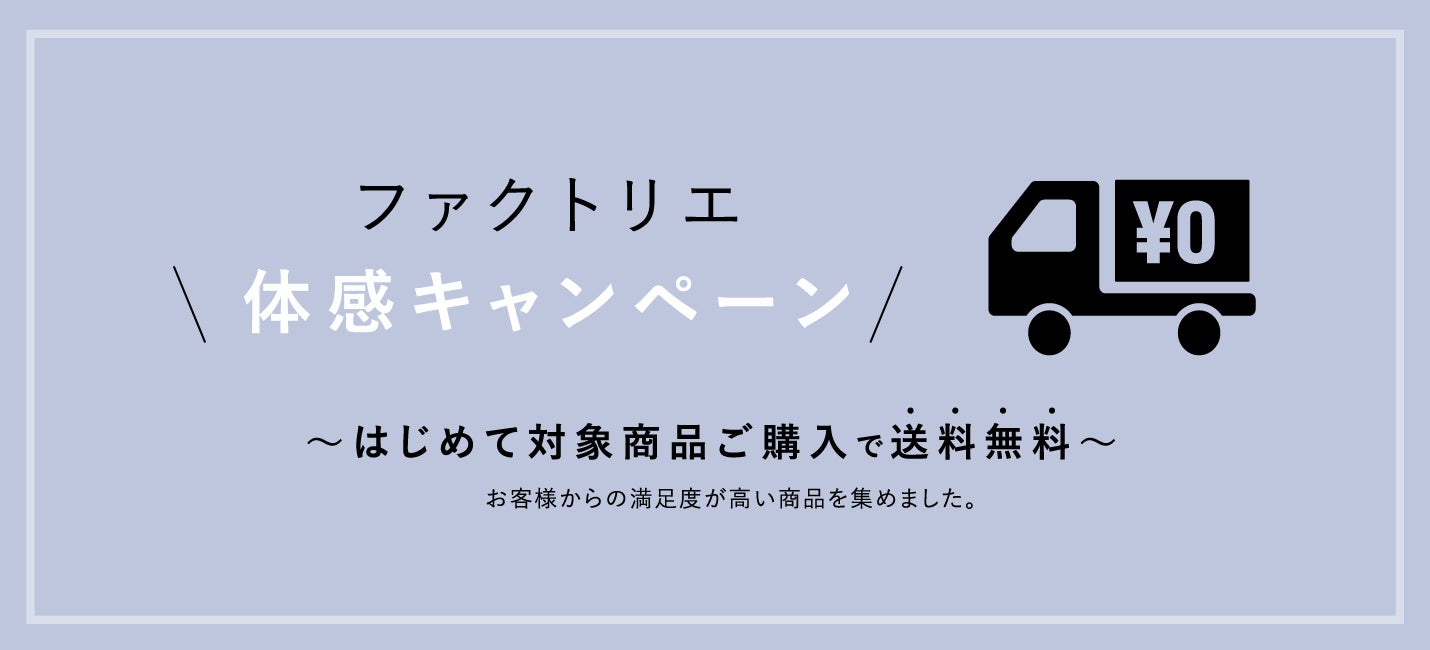 そんなお客様からの声を受け、厳選した“対象商品”を“初めて”購入いただいたお客様限定で、送料が無料になるキャンペーンを実施いたします。ファクトリエをすでにご利用いただいているお客様でも、対象商品をお持ちでなければ送料無料です。まだ手に取っていらっしゃらないお客様は、ぜひこの機会にお試しください。