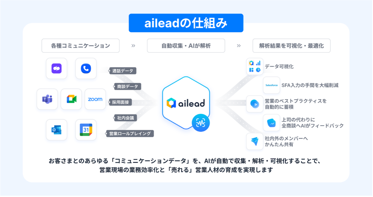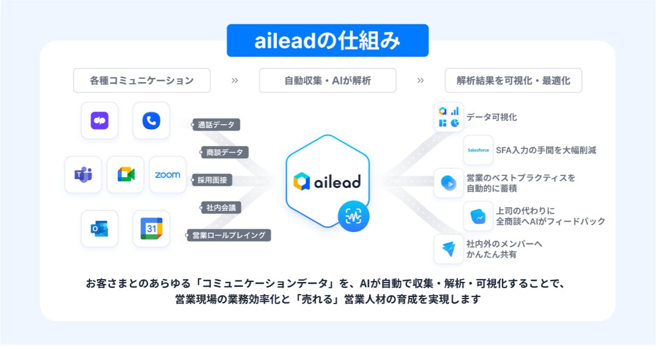 商談・面談データ解析クラウド ailead(エーアイリード)は、“営業・人事部長の右腕”として、業務効率化と人材育成を通じた生産性向上を支援するツールです。