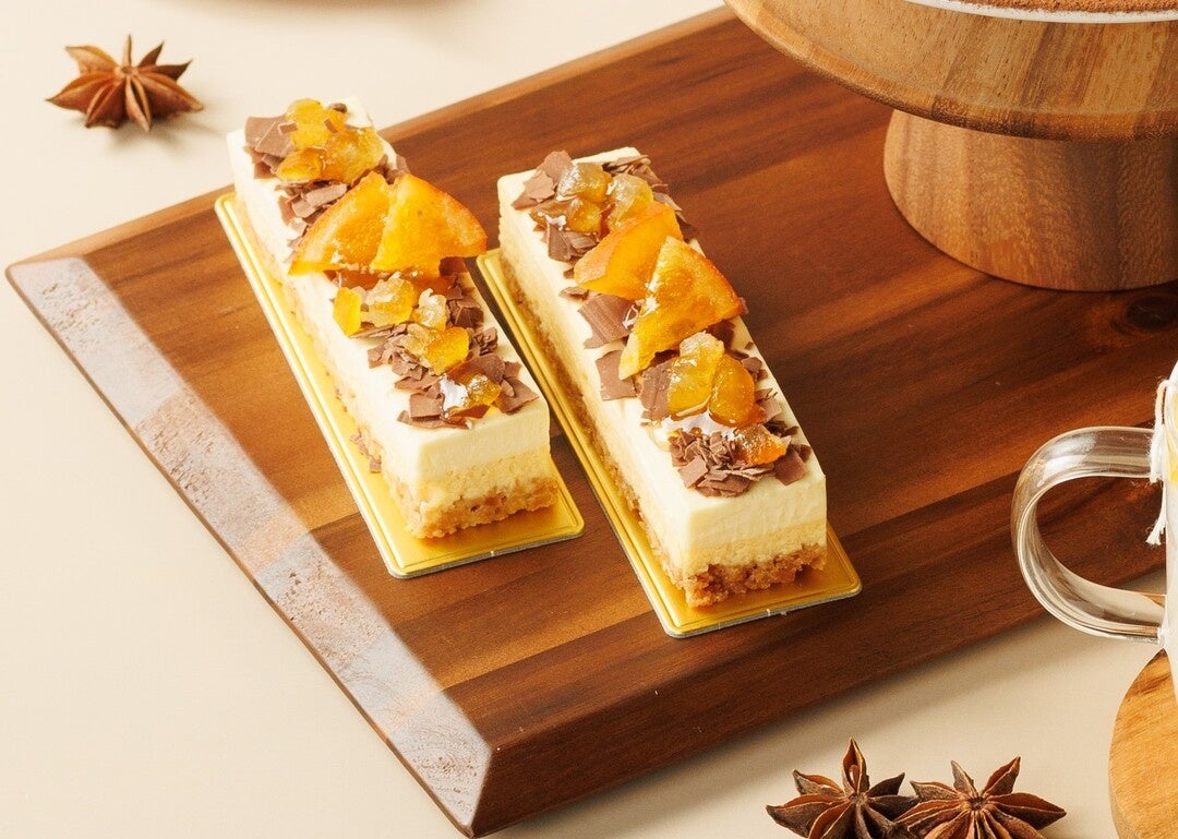 オーストラリア産クリームチーズを使用したベイクドチーズケーキと、オーストラリア産マスカルポーネチーズを使用したレモンが香る爽やかな味わいのレアチーズケーキの相まった美味しさが楽しめます。チョコレートコポー、オレンジピール、ドライオレンジを盛り付け、オレンジソースをかけて仕上げた、チーズとチョコレートの濃厚な風味にオレンジの程よい酸味と甘みがひろがるスティックタイプのチーズケーキです。ご家族や大切な方、ご友人へのバレンタインギフトにもぴったりです。