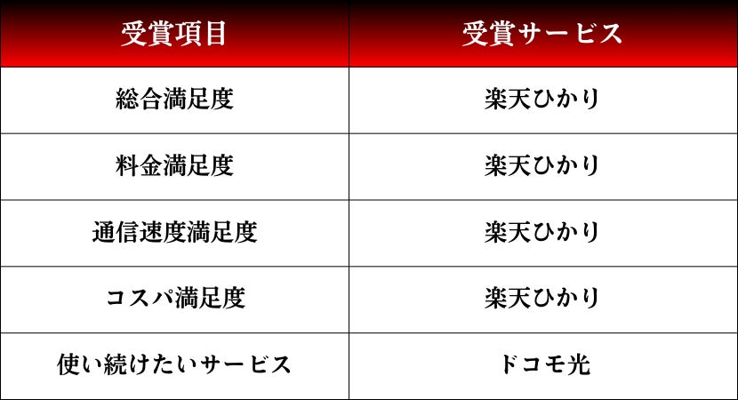 光コラボレーション部門では、楽天ひかりが「総合満足度」「料金満足度」「コスパ満足度」「通信速度満足度」で4冠を達成しました。「使い続けたいサービス」ではドコモ光が受賞という結果になりました。