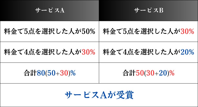 例)「料金満足度」の項目でアワード受賞先を決定する場合の例