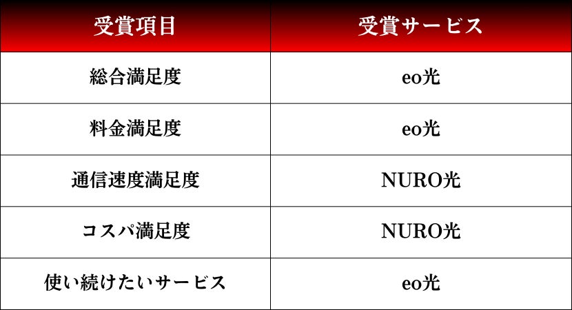 独自回線 部門では、「総合満足度」「料金満足度」「使い続けたいサービス」でeo光が3冠、「通信速度満足度」「コスパ満足度」ではNURO光が2冠という結果になりました。