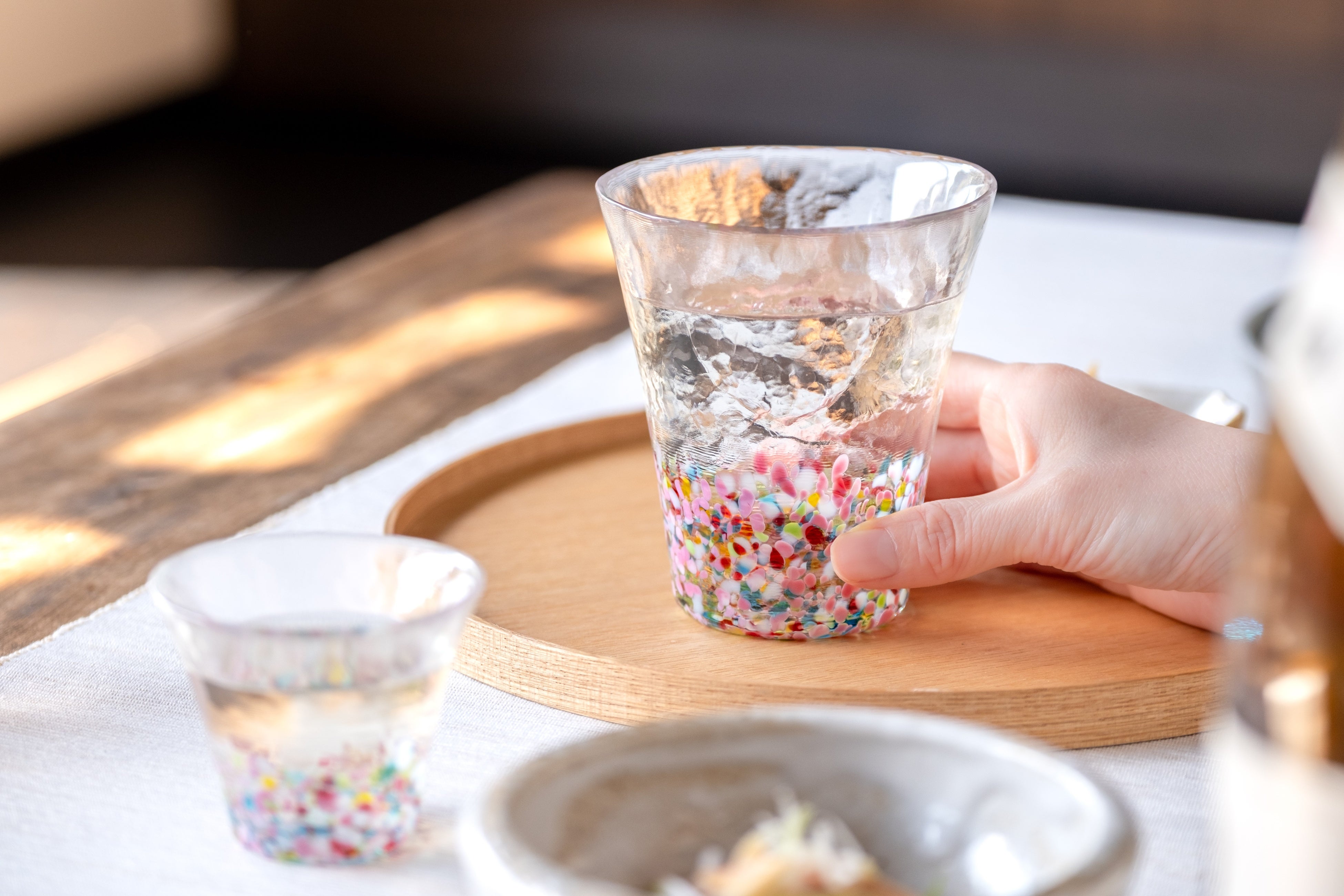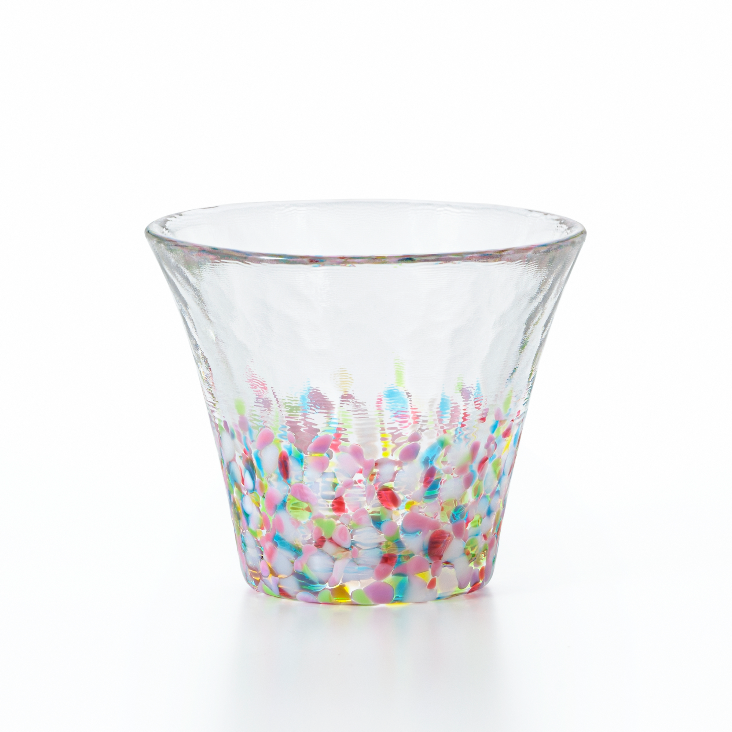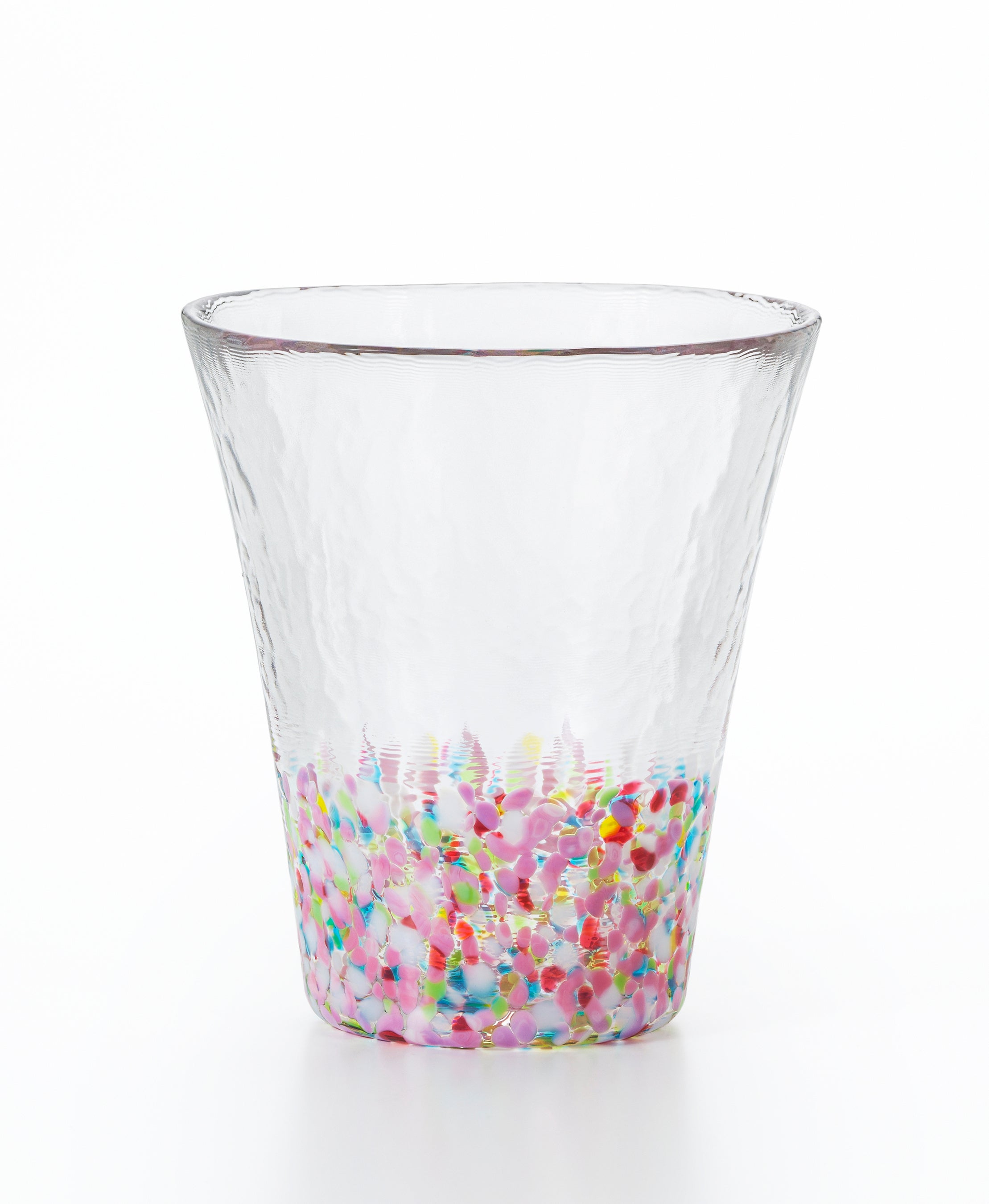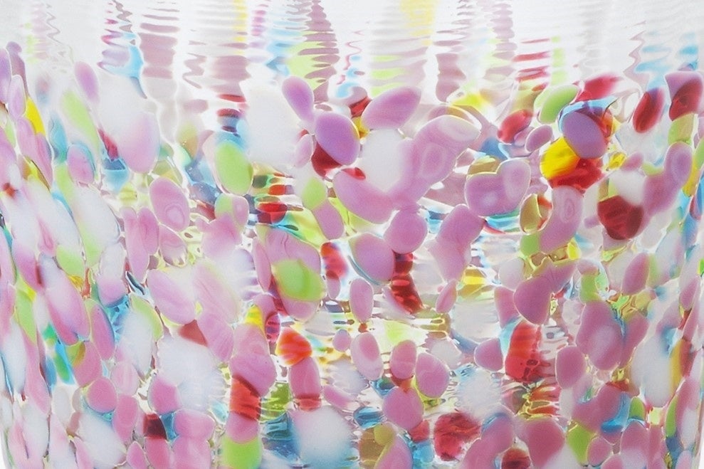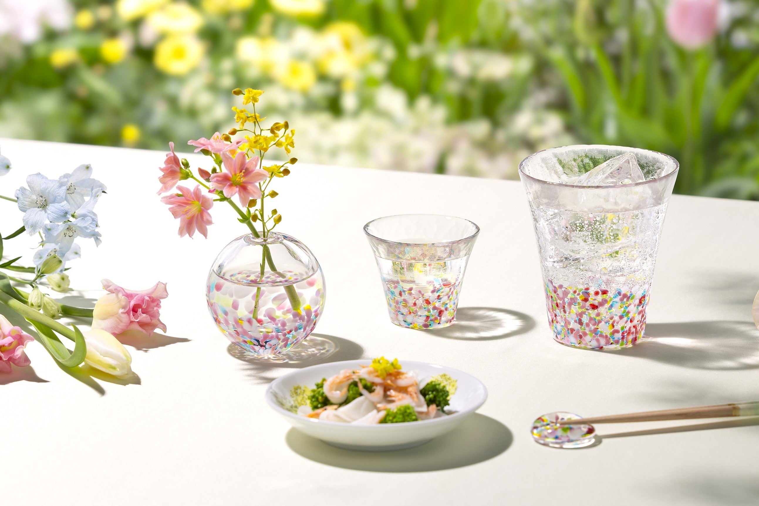 「にほんの色 ふうけい」は、情緒あふれる日本の美しい風景の色合いを多彩な色粒を散りばめて表現したグラスシリーズです。2025年10月に津軽びいどろファンの皆さまへ実施した「あなたの景色が、新しい“ふうけい”に」アンケートキャンペーンには約400件もの声が寄せられ、その中でも多く挙がった“春の訪れ”をテーマに新色「春の丘」を開発しました。青空のもと暖かな陽ざしを浴びて咲く花々を、赤・ピンクを基調に白や黄色、青、黄緑を重ねたマルチカラーで表現。従来の「にほんの色ふうけい」の配色“ベース色+差し色”とは異なる、華やかで奥行きある色合いが特長です。