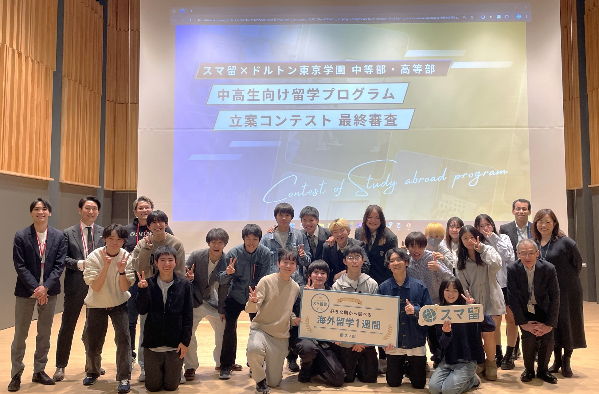 海外留学エージェント『スマ留』を運営する株式会社リアブロード(本社:東京都渋谷区、代表取締役社長:神田慎)は、ドルトン東京学園中等部・高等部(東京都調布市、校長:安居 長敏)と連携し、12月18日(水)に学生が自身の視点で中高生向け留学プログラムを立案する「中高生留学プログラム立案コンテスト」の最終審査を実施いたしました。最優秀賞受賞者はスマ留と共同でプログラムの開発に携わり、語学留学体験を通じて来春頃の商品化を目指します。