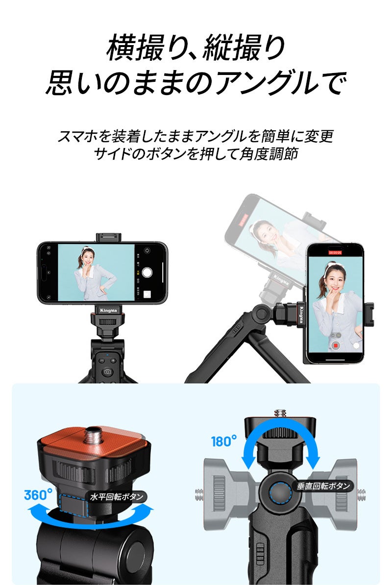グリップを使用することで、ローアングルの撮影も楽になります。グリップのアングルボタンを押してアングルが変更できるので、わざわざスマホホルダーから取り外すことなく、アングルの変更が可能です。