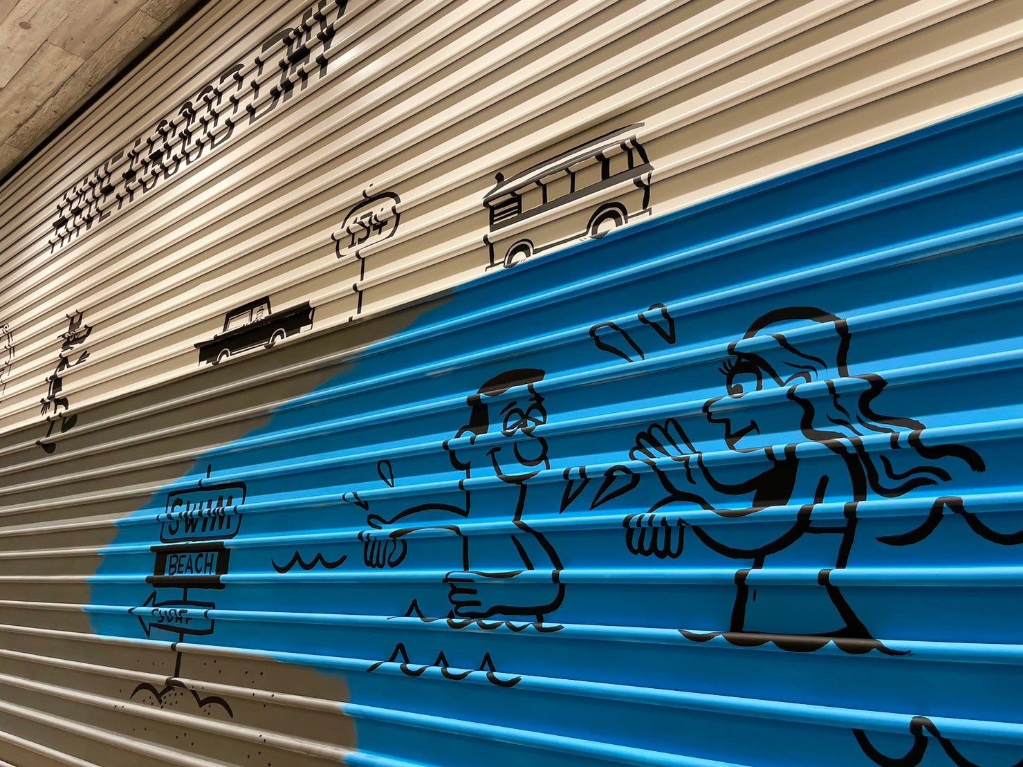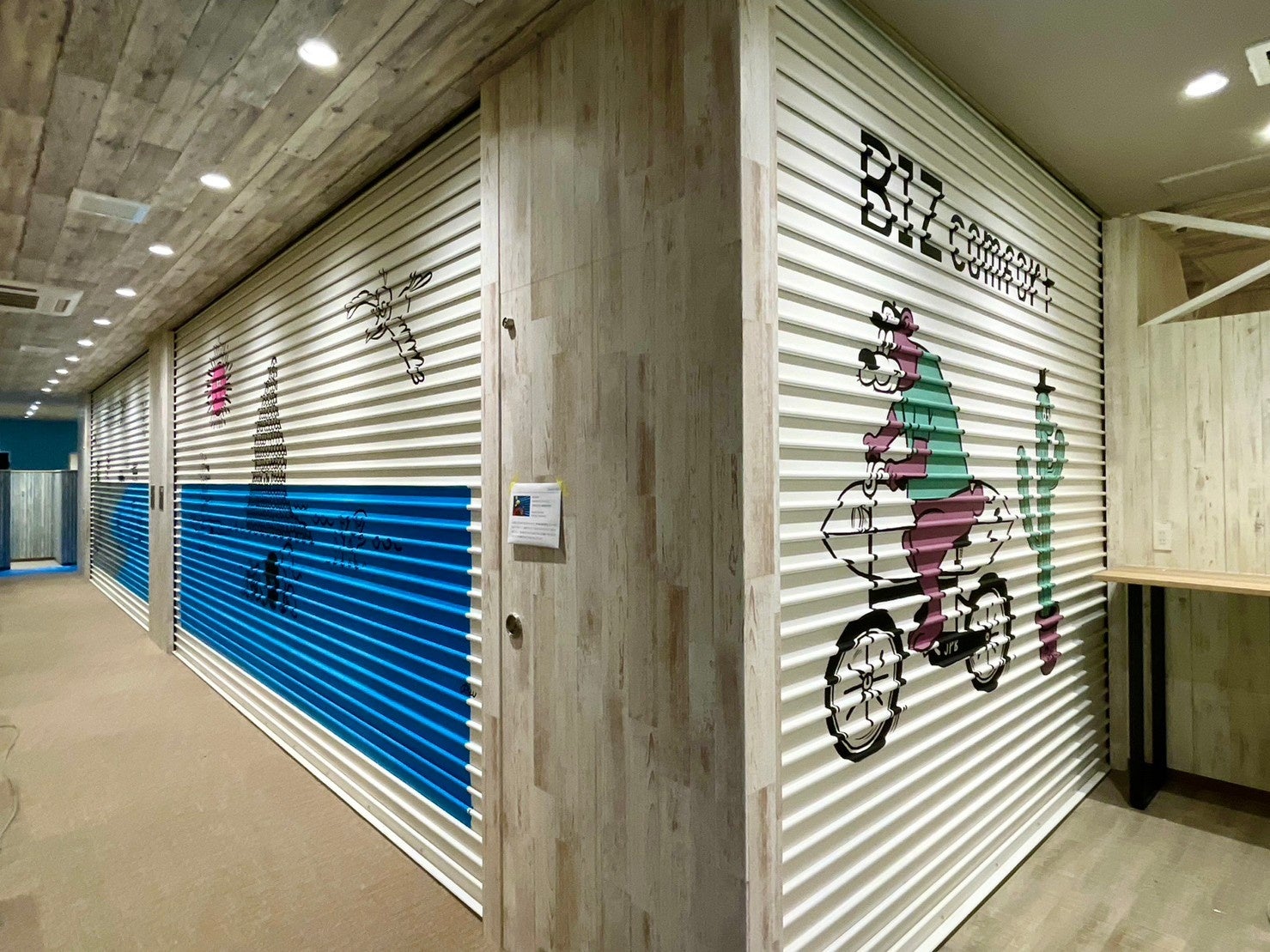 シェアオフィスを利用する方は、長時間パソコンと向き合いながら、ときに缶詰め状態でがんばる方もいるのではと思います。ふと顔を上げた時に見えたシャッターに、茅ヶ崎の海を表現したアートが拡がっていることで、息抜きやリラックスをしてもらいたいという想いで制作しました。