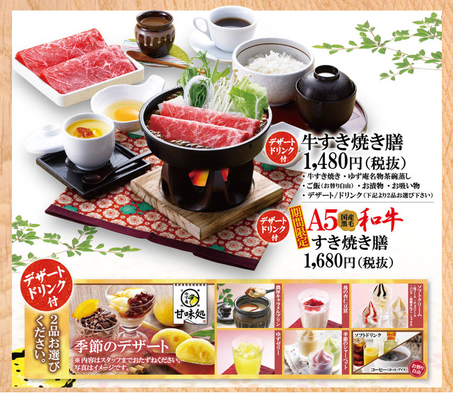 また、京都産九条ねぎなどの旬の野菜を中心に取りそろえたしゃぶしゃぶ具材は、大人気の「すき焼きだし」にぴったりです。デザートには、濃厚チョコパフェや柚子クリーム大福、ほうじ茶シロップで⾷べるタピオカ⾖乳プリンの3種類をご用意。
