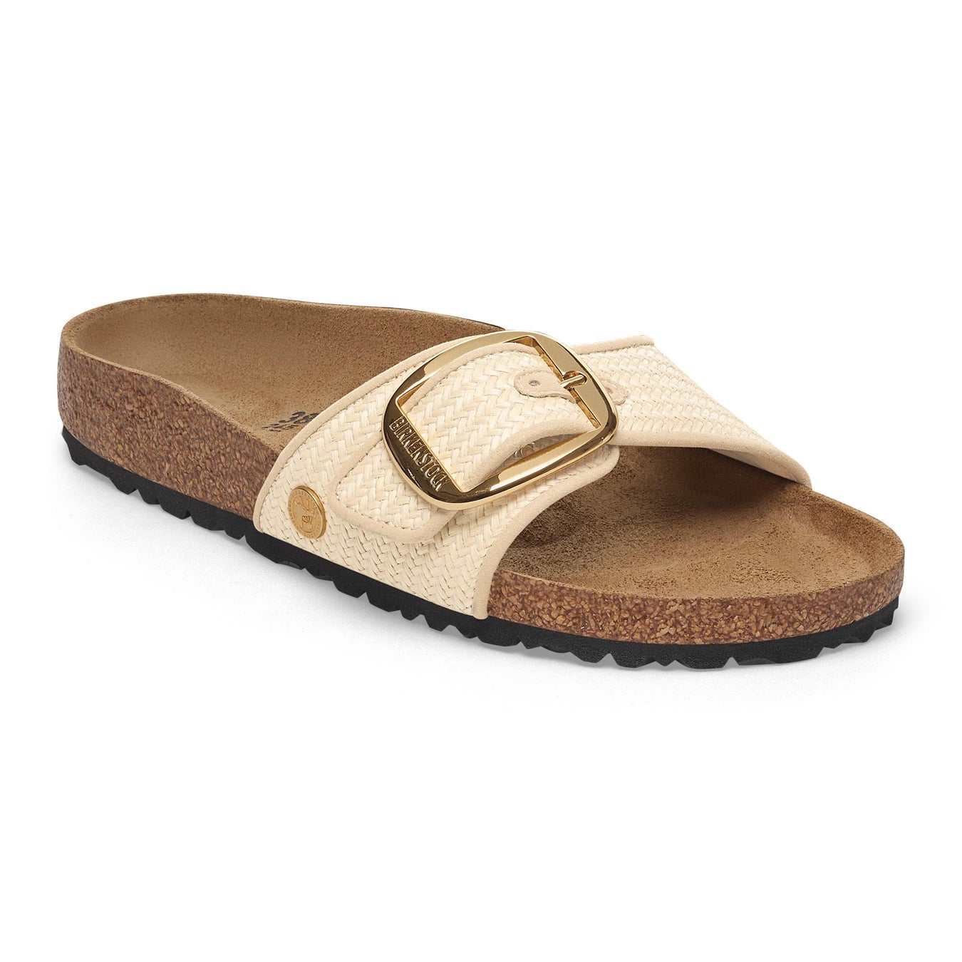 今回発売されるMADRID とARIZONAでは、この天然コルクのフットベッドがラフィアの素材感と絶妙にマッチし、夏の素足に軽やかな抜け感を添えます。きらりと輝く大ぶりのバックルは夏の人気仕様で、ナチュラルとブラック、それぞれのカラーを引き立てます。