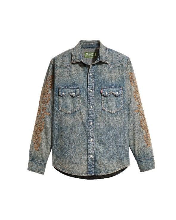 Levi's® ブランドと Denim Tears は、バイカーカルチャーにおける様々な美学を、アメリカ系アフリカ人の系譜というプリズムを通して融合させ、バイカーズコードを形成する本物であることへのこだわり、リアルさ、自由、そして型にはまらないことへの反抗を本コレクションで表現しています。このコレクションには、イタリア製のプレミアムレザーを使用し、スエードにエンボス加工を施した両ブランドのコラボレーションパッチや、伝統的なモーターサイクルを彷彿とさせるシンチが施されたDenim Tearsのコットンリースモチーフを全面にプリントしたLeather Cotton Wreath Type III Jacketが登場します。セットアップで着ることができるレザーパンツと合わせれば、自信に満ち溢れた圧倒的な自己表現が叶うでしょう。本コレクションには、2023年に150周年を迎えるWestern Stitch 501® Jeans、そしてセットアップになるWestern Stitch Denim Shirtの2つのクラシックなシルエットがラインナップ。どちらも着古したようなライトインディゴカラーで、アーム、バックヨーク、レッグの外側に刺繍されたウエスタンモチーフが特徴です。さらに、同じく古着の様な風合いのブラックデニムのWestern Cowboy Shirtは、シェルパカラー、胸元から背中のフリンジのディテール、レザーによるレースクロージャーが目を引きます。