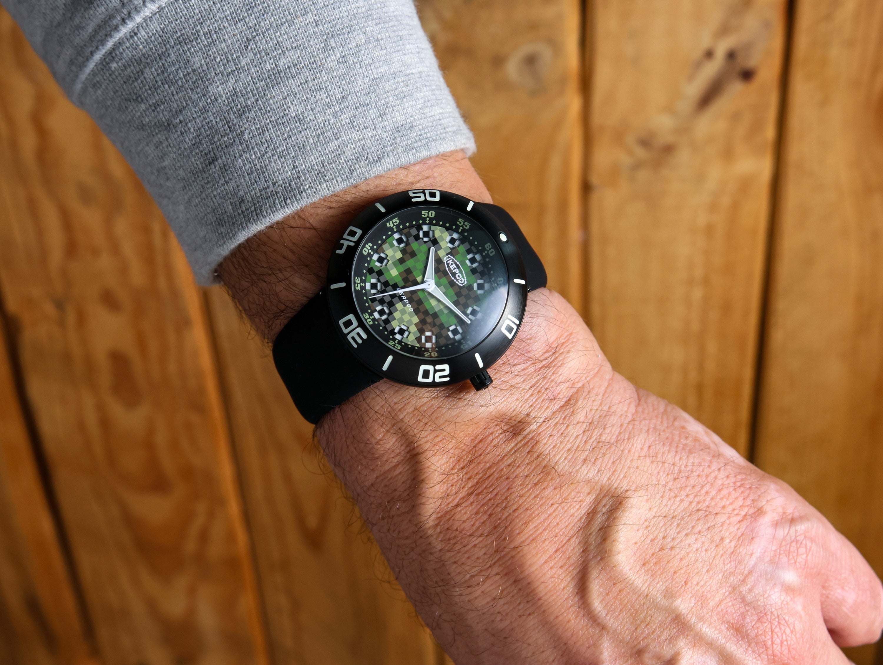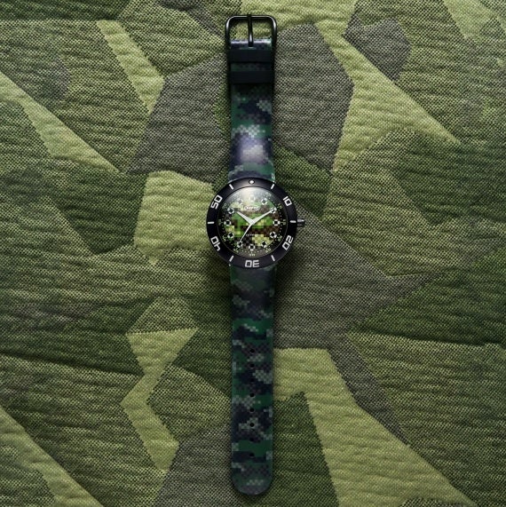 「SEAPOD PIXPAD CAMO」のデザインコンセプトは「デジタルカモフラージュ」。2001年に開発され、数多くのファッションブランドでも使用されているカモフラージュパターンと世界的に人気が高いストラテジーゲームからインスピレーションを受け、ピクセル化したグリーンのカモフラージュでダイヤルとストラップを彩ります。