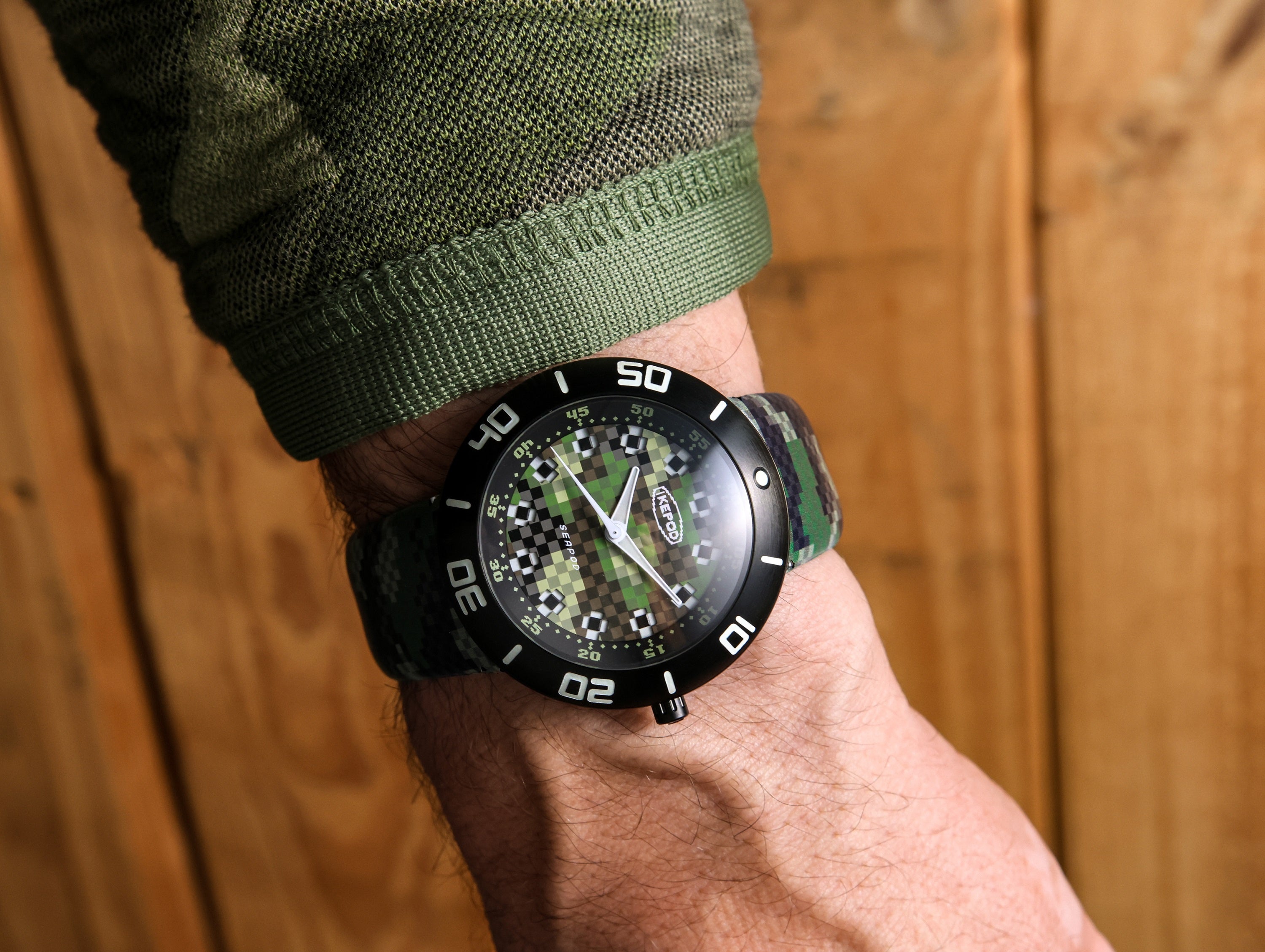 2023年ホリデーシーズン、IKEPODの「SEAPOD」シリーズにピクセル化されたグリーン迷彩柄のダイヤルとストラップが目を引く、デザイン性の高い「SEAPOD PIXPAD CAMO」が登場。