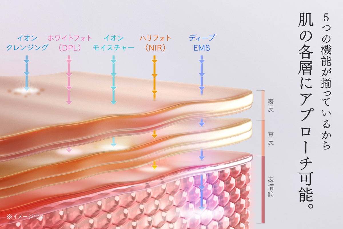 さらにお客様が抱える肌悩みに寄り添うべく、イオン導入・イオン導出機能も加え、本格エイジングケアに必要な全5機能を搭載。これ1台で "光フォト美顔器×リフトケア**美顔器×イオン美顔器" 3台分のケアが可能となりました。