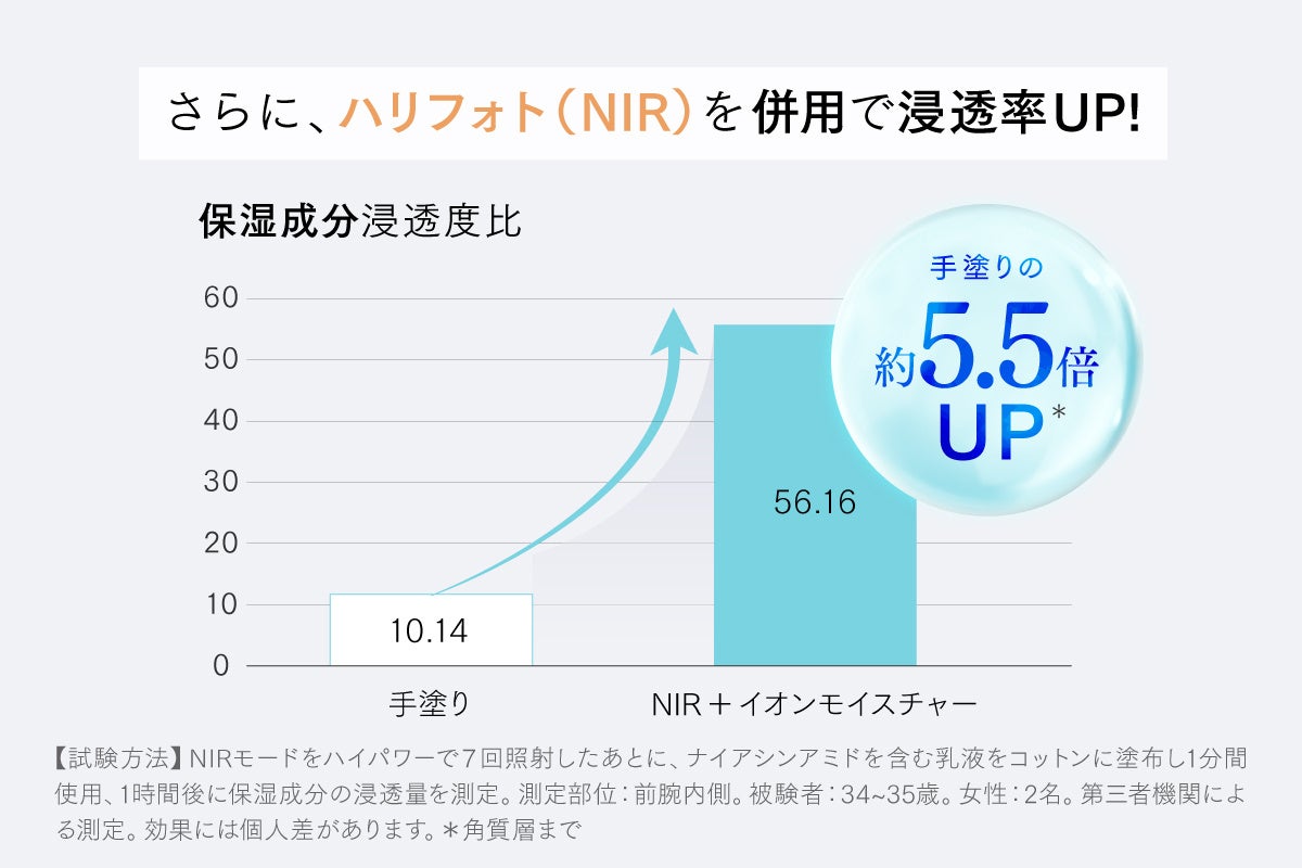また、「ハリフォト(NIR)」使用後に「MOISTモード」を使うと、保湿成分の浸透率も約5.5%もアップします。肌にうるおいを補給し、日常のデイリーケアをワンランク上の体験へ。