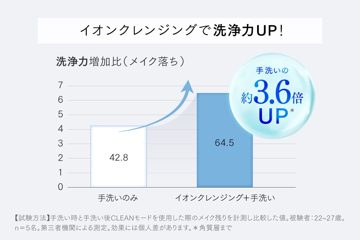 イオン導出「CLEANモード」は角質・くすみを軽減し、洗顔では落としきれない毛穴汚れや古い角質を取り除きます。手洗いのみの時に比べて洗浄力が約3.6倍もアップし、毛穴の黒ずみが気にならない、清潔でクリアな素肌を叶えます。