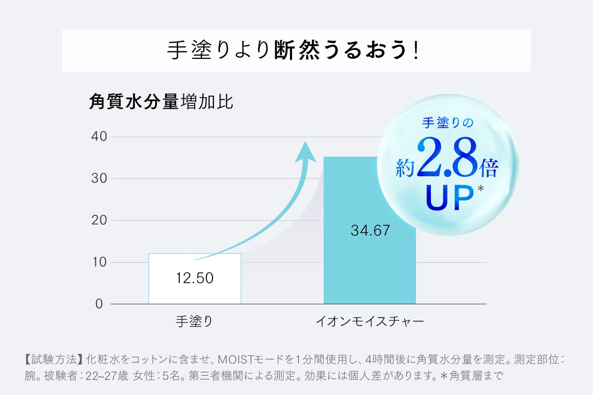 イオン導入「MOISTモード」を使用すると、手塗りのみの時に比べて肌の潤いが約2.8倍もアップ。