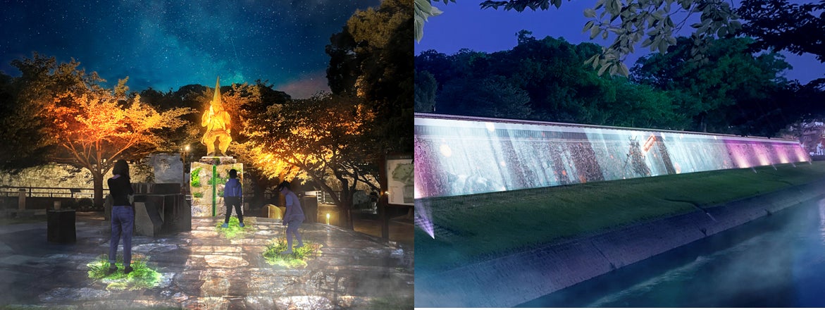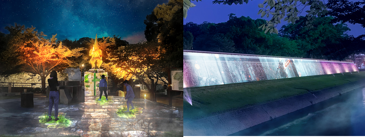 イベント概要:国の重要文化財・熊本城の長塀へのプロジェクションマッピングを初めて開催するほか、加藤清正像周辺では、人の動きに合わせて様々な映像コンテンツが変化するインタラクティブムービー、城彩苑入り口での装飾など、熊本市の新たな夜をご体感いただけます。