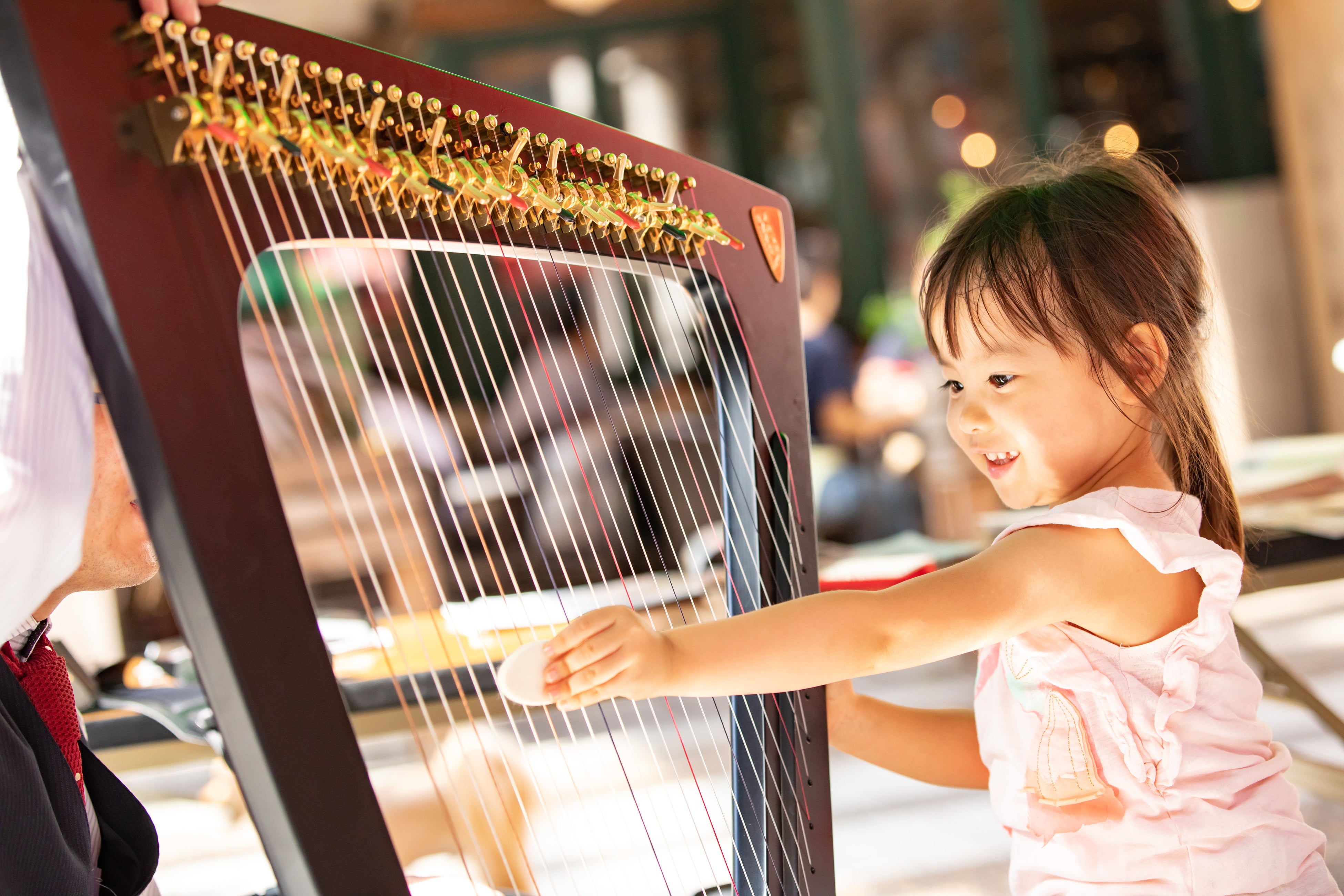 開放的な屋外広場で専門家によるレクチャーのもと、ハープやアコーディオンなど普段なかなか触れることのできない楽器に触れられる体験コーナーが登場。上質な音楽を身近に体験することで、お子さんの感性を引き出す機会を提供します。