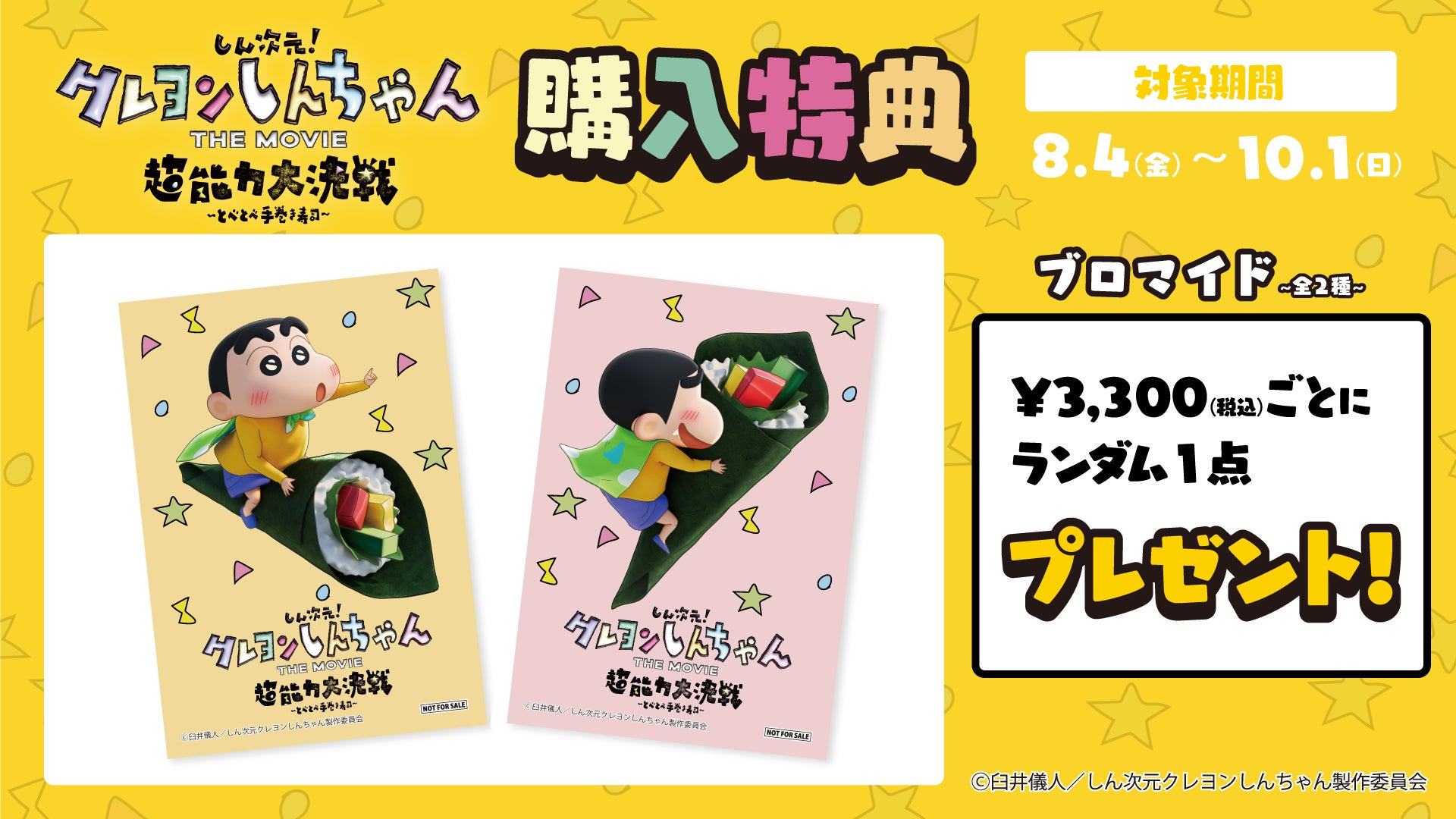 販売期間中(2023/8/4〜10/1)、映画『しん次元!クレヨンしんちゃんTHE MOVIE 超能力大決戦 ~とべとべ手巻き寿司~』対象商品の合計注文金額3,300円(税込)お買い上げごとにランダムでオリジナルブロマイド(全2種)を1点プレゼントいたします。