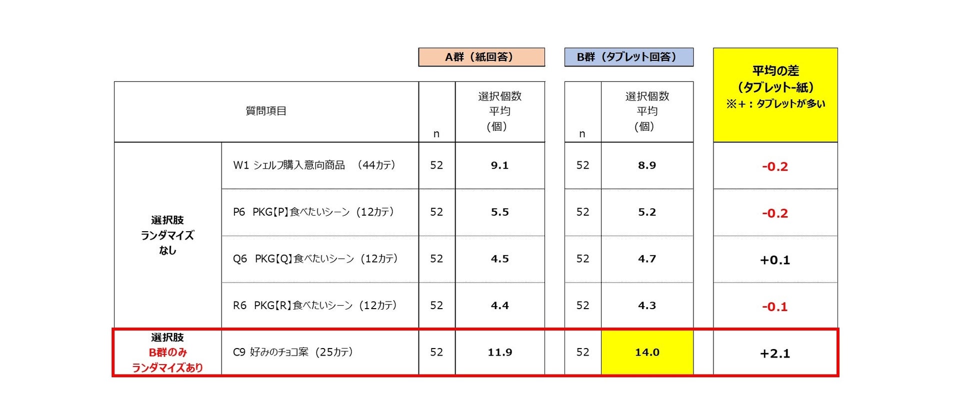 選択個数は、ランダマイズなしの同条件下ではほぼ同等となりますが、タブレット回答はランダマイズ制御をかけることで選択個数はやや増加しました。選択肢数の多い設問のランダマイズ制御は、選択肢の位置バイアスや回答時の集中力の中だるみを軽減し、回答の正確性を高めます。