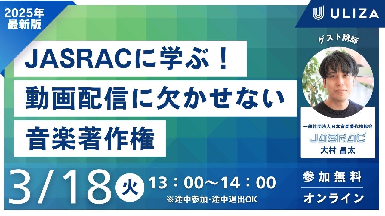 このセミナーで一般社団法人日本音楽著作権協会(JASRAC)の大村 昌太さんをゲストにお招きし、音楽著作権の概要から動画配信で注意したいことまでをご紹介します。