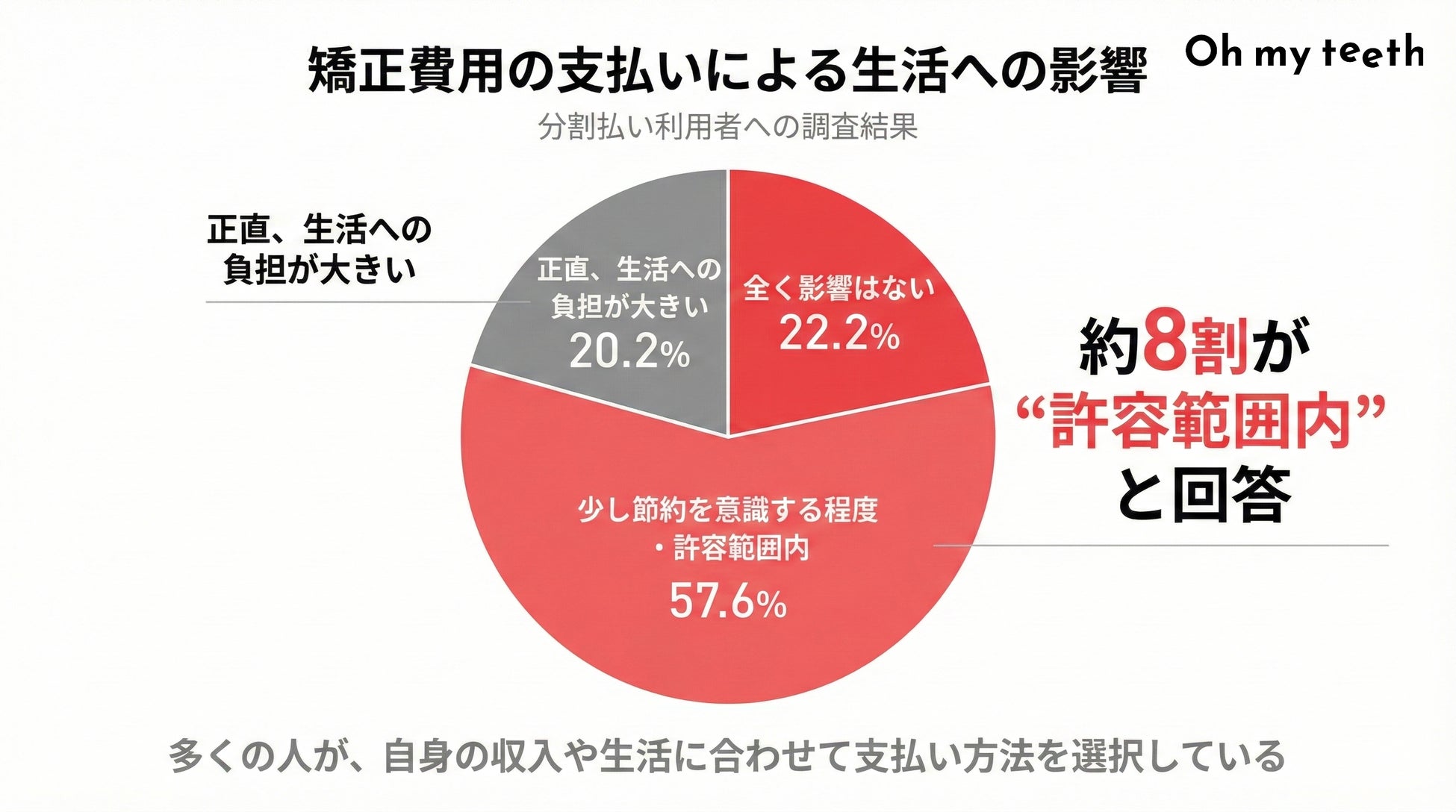 調査の結果、現金やクレジットカードによる一括払い、親・家族による費用負担を含めた「一括系」が約8割を占める一方、分割払いを選択した人も2割を超えていることが分かりました。なかでも、4人に1人は親や家族が費用を負担しており、歯列矯正が本人のみの判断ではなく家庭内でポジティブな投資として合意されている実態が浮き彫りになりました。