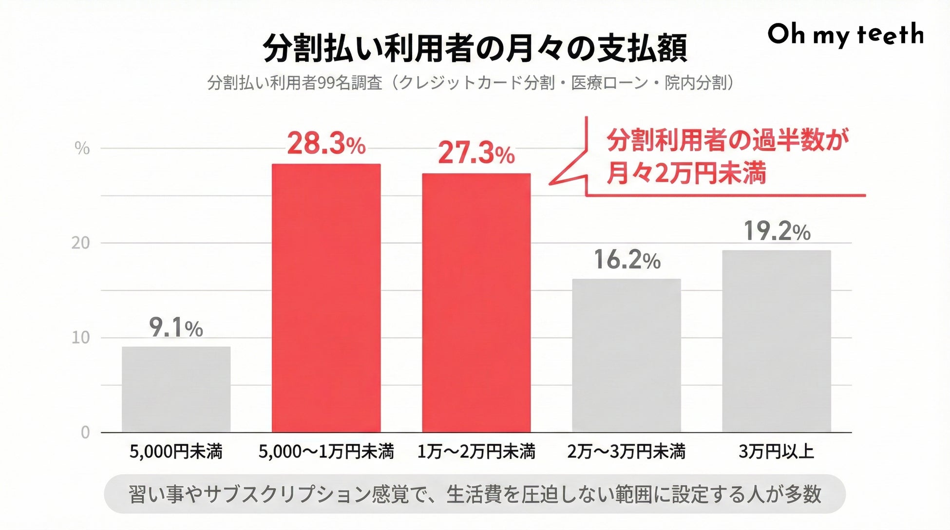 分割払い(クレカ分割・医療ローン・院内分割)を利用した99名に「月々の支払額」を聞いたところ、最も多かったのは「5,000円〜1万円未満(28.3%)」と「1万〜2万円未満(27.3%)」でした。