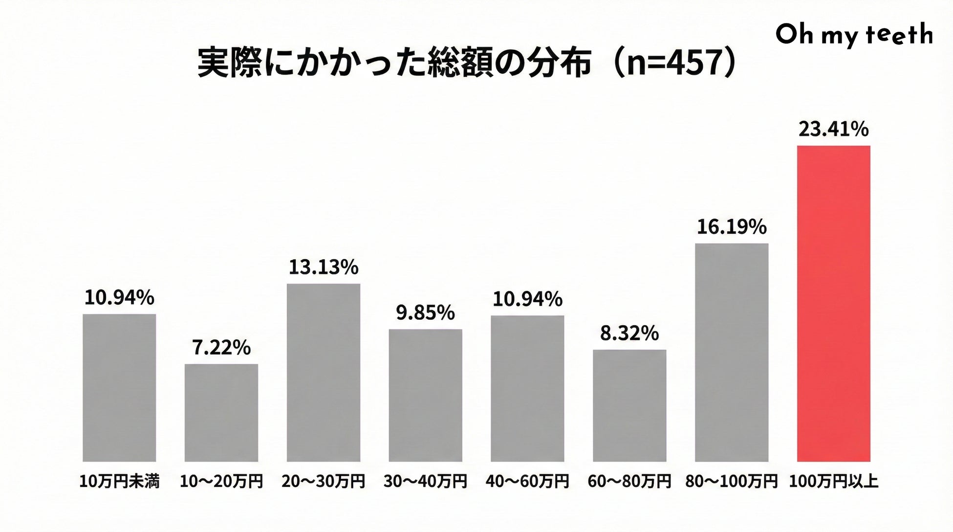 実際にかかった治療総額を聞いたところ「100万円以上(23.4%)」という層がいる一方で、「40万円未満」で治療を終えた層も約4割(41.1%)存在しました。