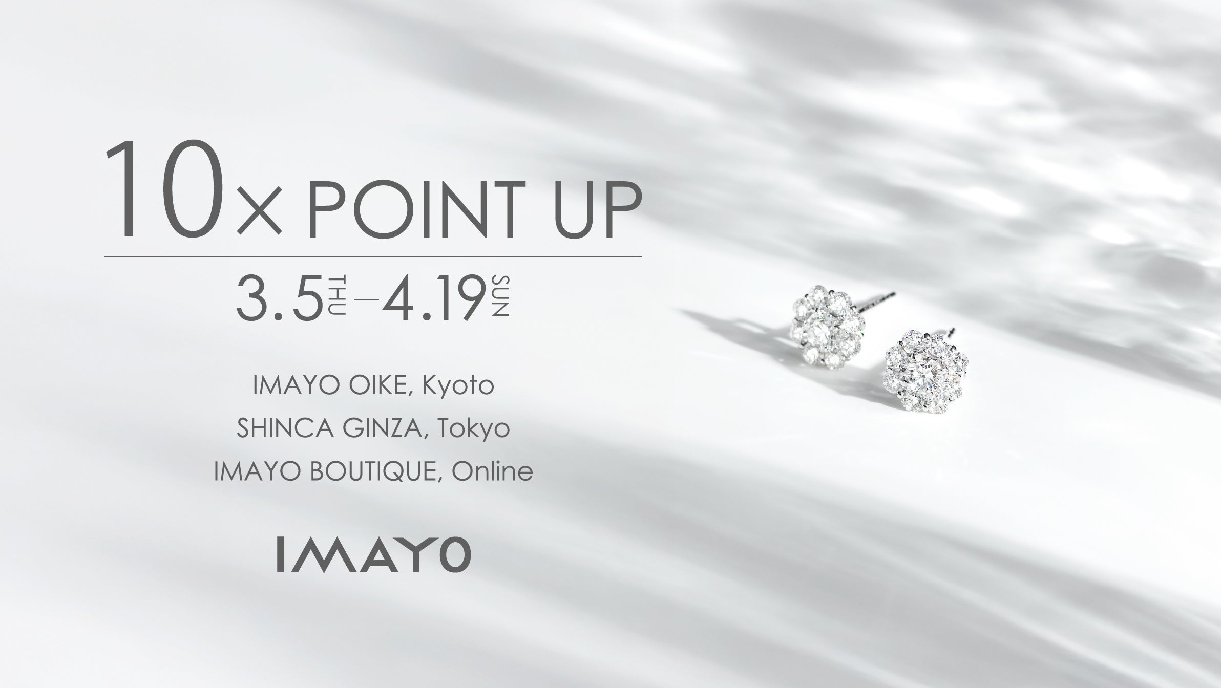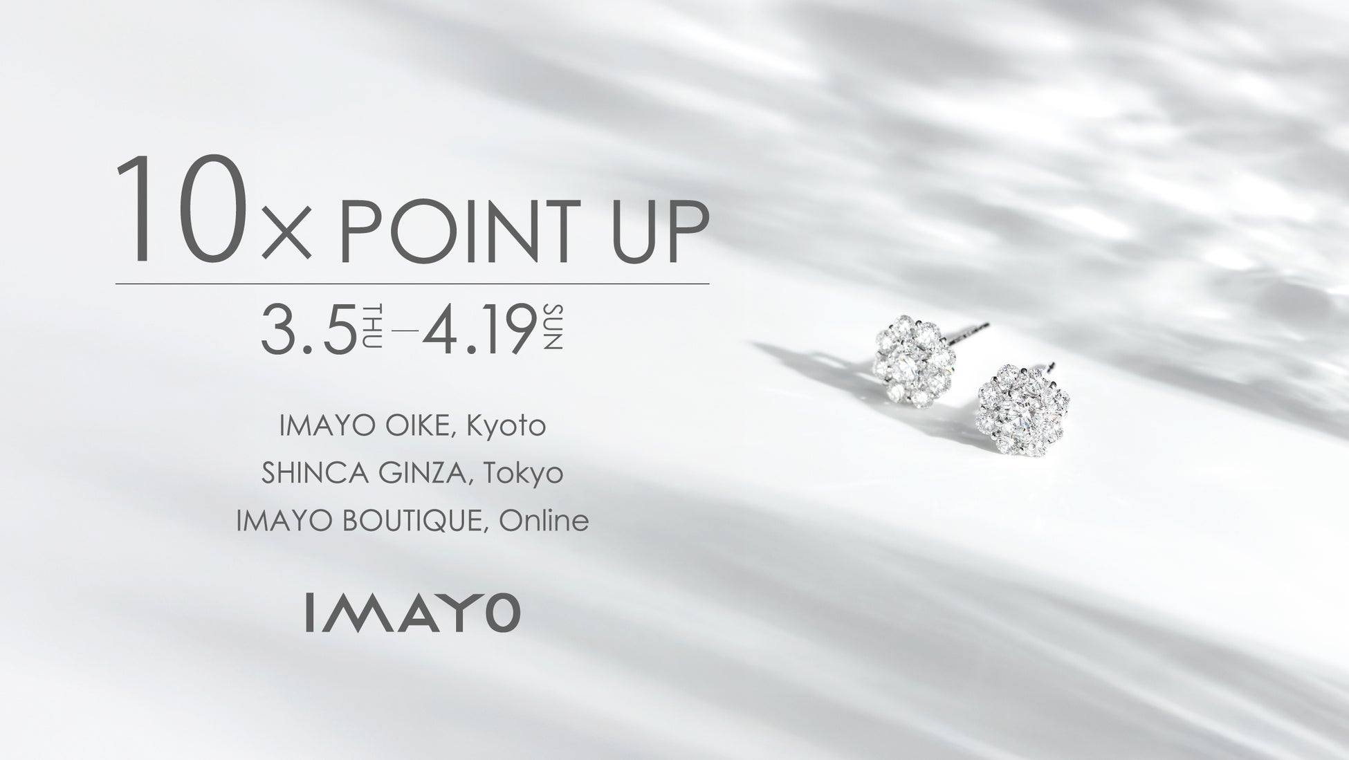 「IMAYO THANKS SPECIAL ポイントアップキャンペーン」は、国内直営店(IMAYO 京都御池店、SHINCA 銀座)または、公式オンラインショップ(IMAYO Boutique)で、当社が展開する4つのジュエリーブランド「kagayoi(かがよい)」「Hyacca(ヒャッカ)」「ICHAROI(イサロイ)」「SHINCA(シンカ)」のいずれかの商品をご購入いただいた会員様を対象に、通常はお買い上げ金額の1%分のポイントを還元するところ、10倍の10%分のポイント還元となるお得なキャンペーンになります。