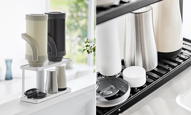 日常使いのグラスや置き場所に困るジャグボトルなどをサッと干せます。