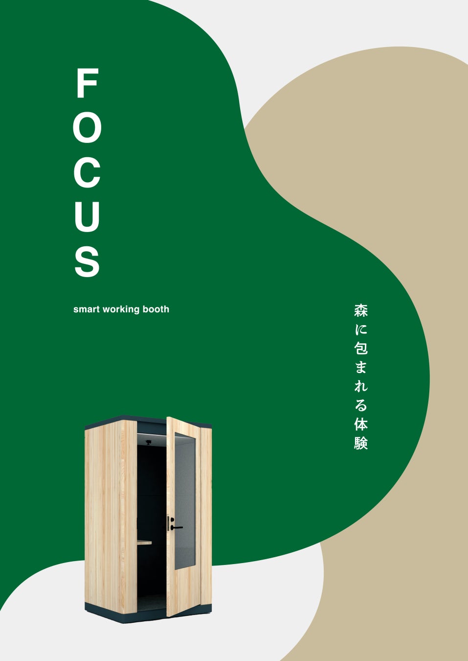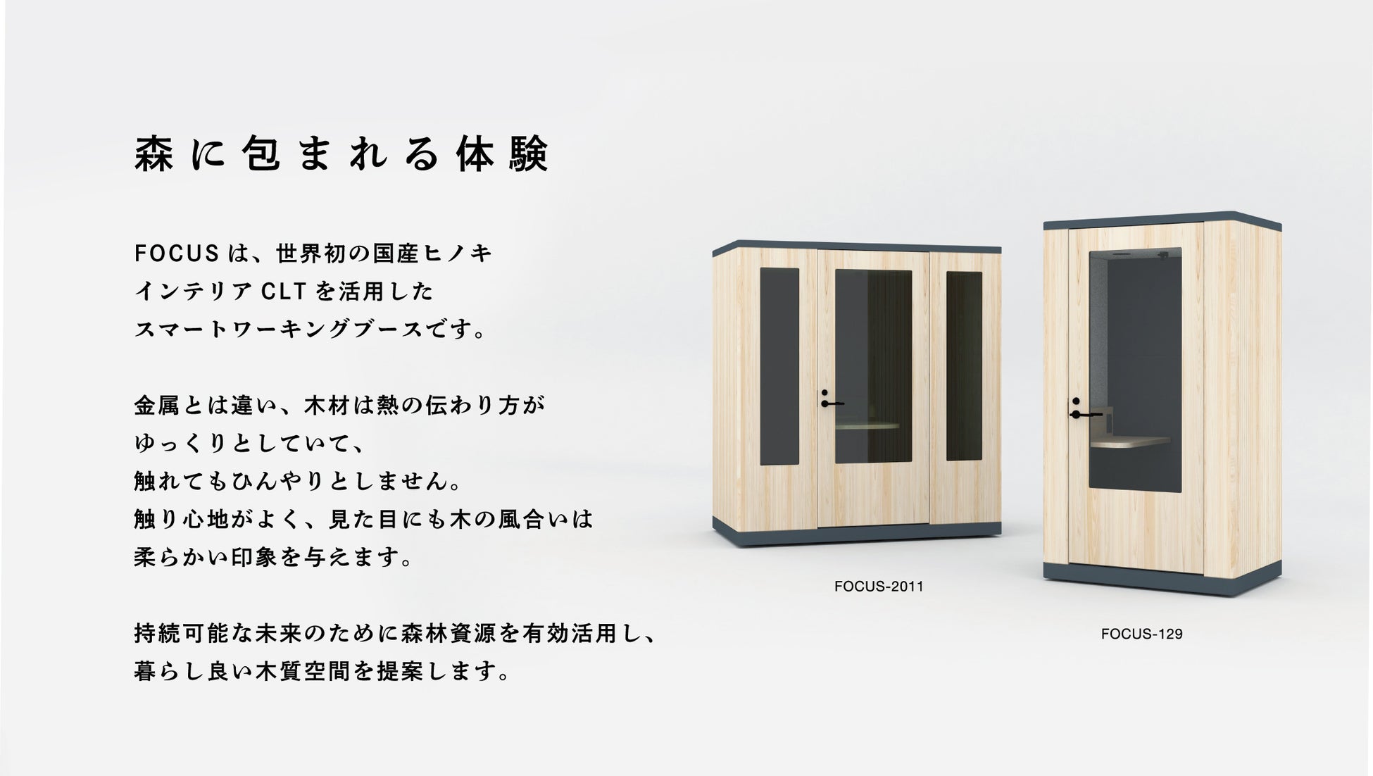国産インテリアCLTを使ったスマートワーキングブース「FOCUS(フォーカス)」の新作を「オルガテック東京2023」で発表します。